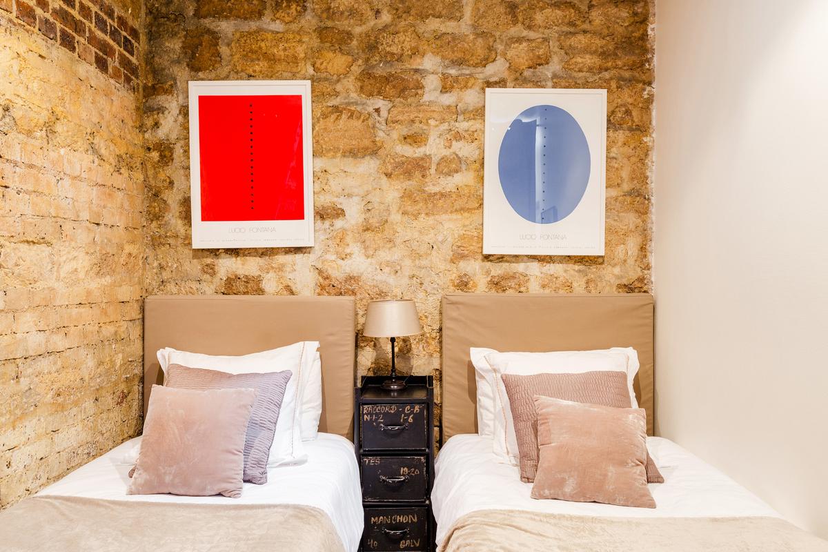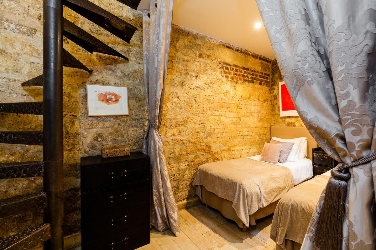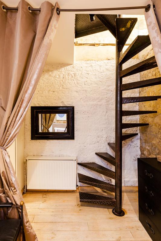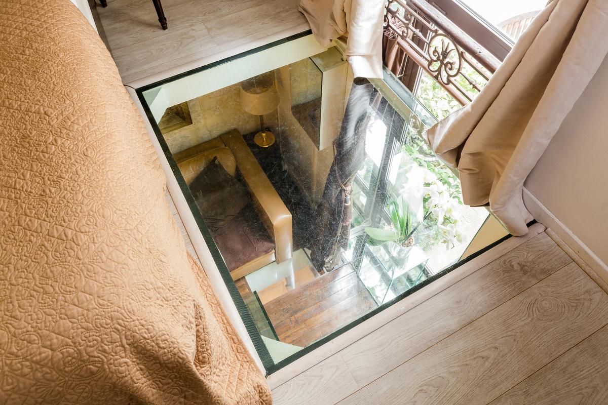 La disposition inhabituelle de l’appartement en fait un espace parfait pour une famille de quatre personnes, une cachette merveilleusement meublée.