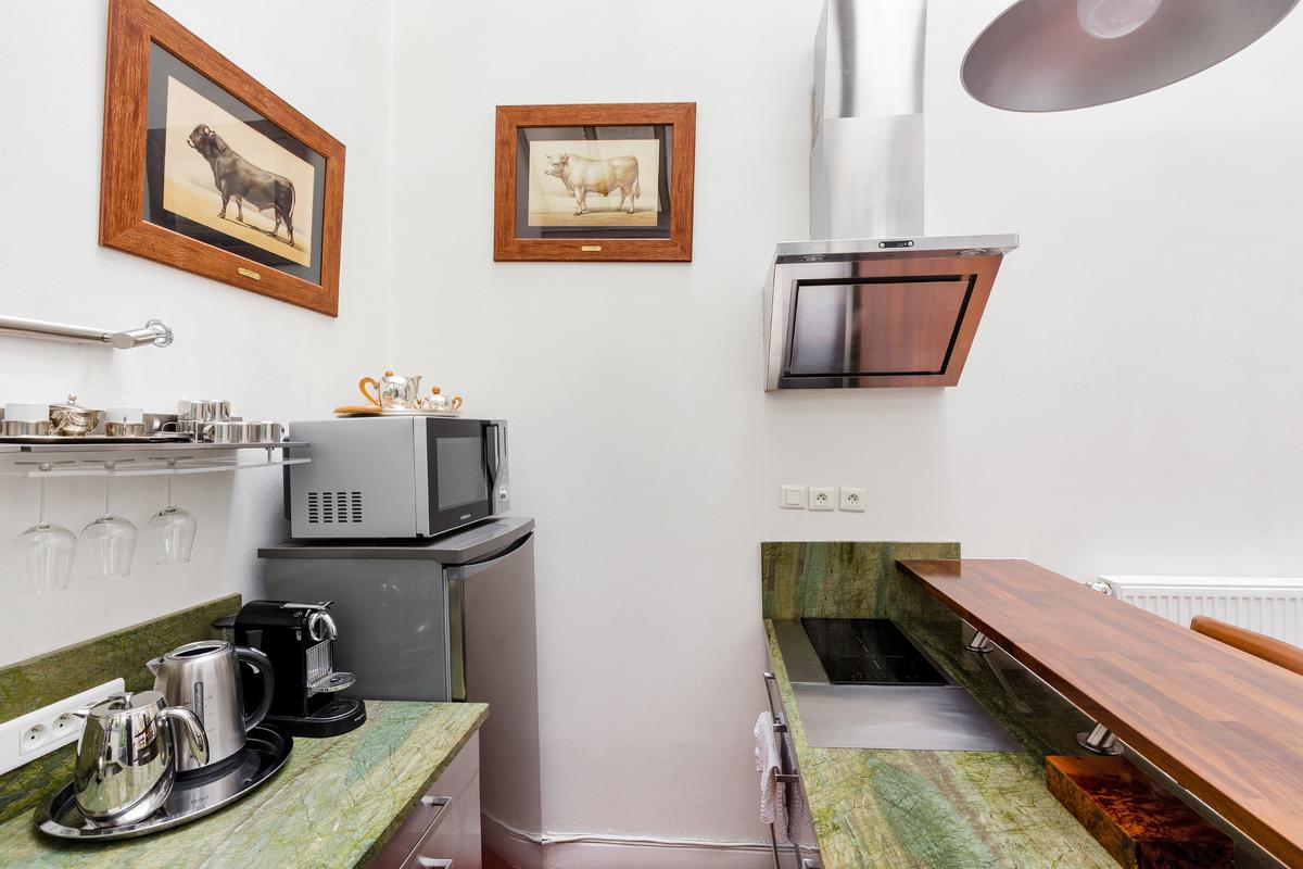 Vous entrez par la cuisine qui a un toit en verre. Plein de lumière, charmant, avec un bar et une table haute pour les repas. Le salon, qui mène également à la cour, se trouve à côté de la cuisine et dispose d’un canapé et d’un téléviseur à écran plat