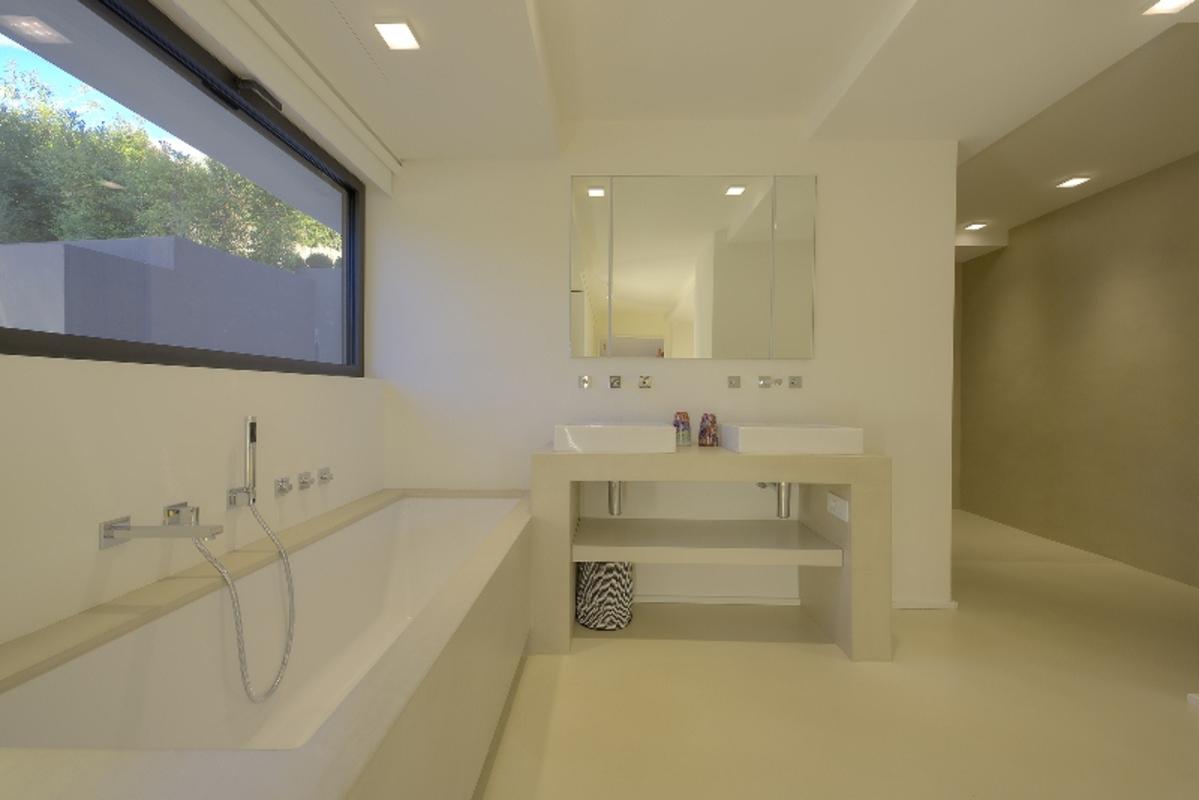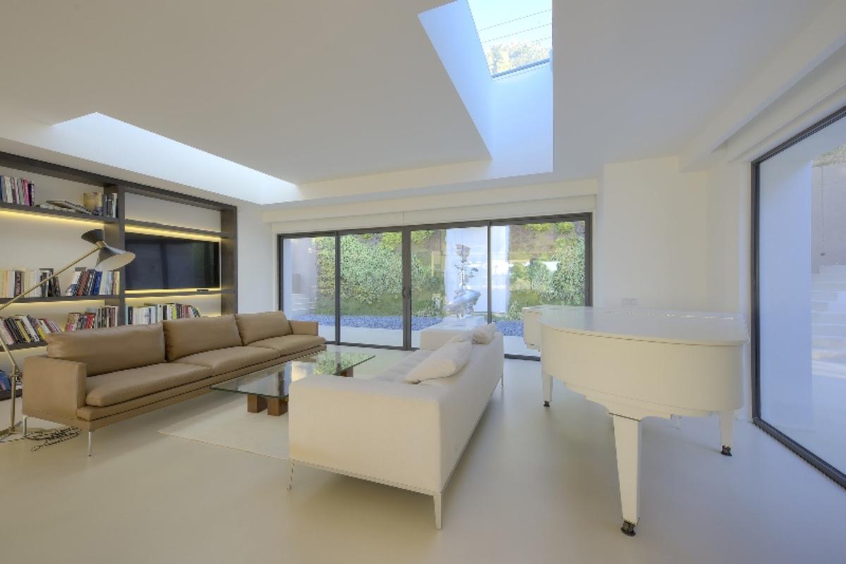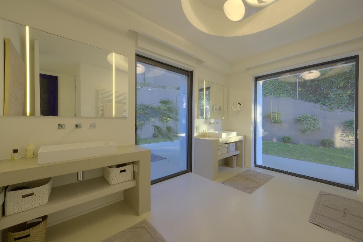 Les 3500m² de terrain arboré bénéficient d’un beau jardin, de terrasses et d’une piscine de 17m. Au premier étage, la villa dispose d’un grand salon donnant sur une terrasse avec vue sur la mer et d’une bibliothèque avec TV écran plat, piano à queue, sonorisation Bose.