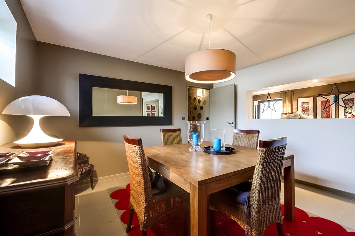 La maison est presque entièrement de plain-pied, organisée autour des espaces extérieurs, avec une chambre à l’étage.