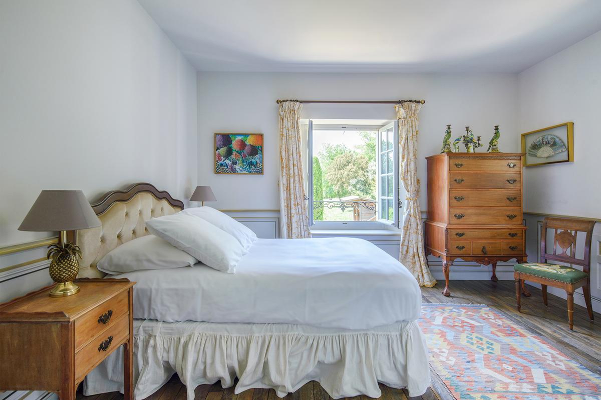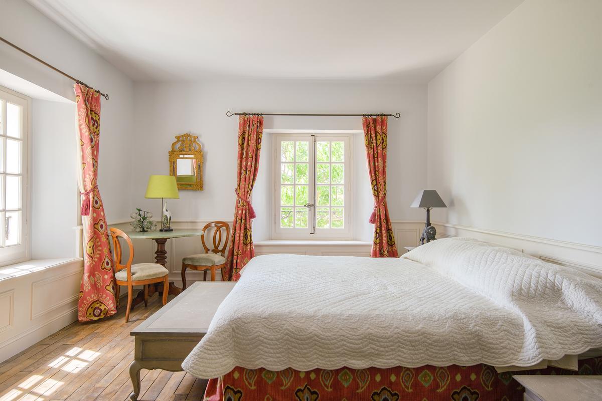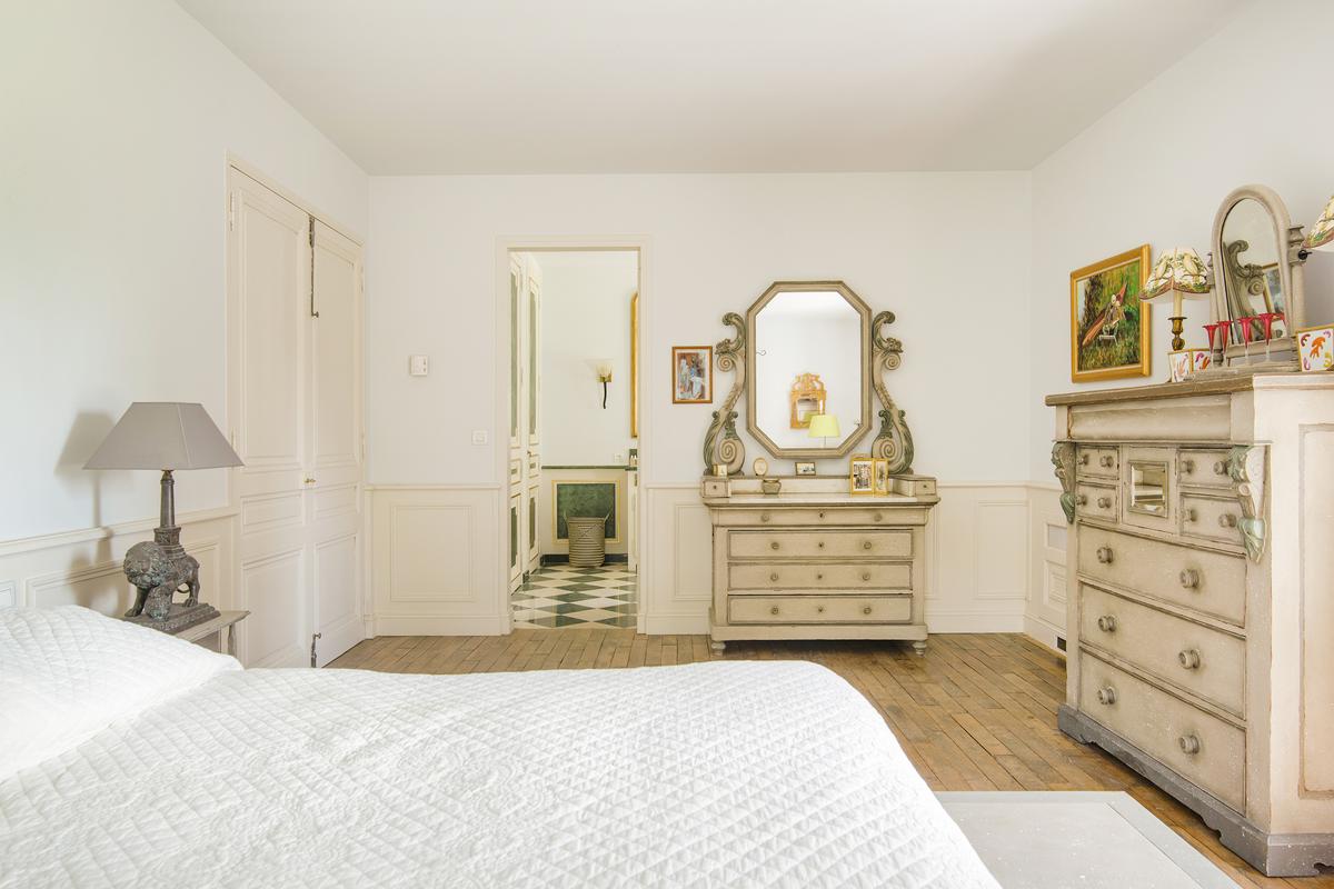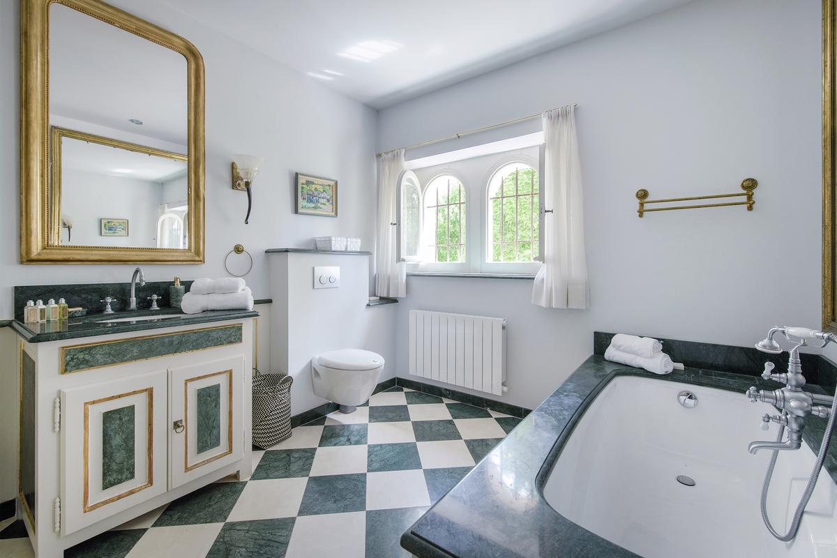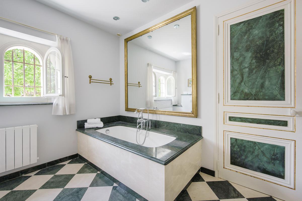 – Chambre 2 : grand lit, salle de bains attenante – baignoire