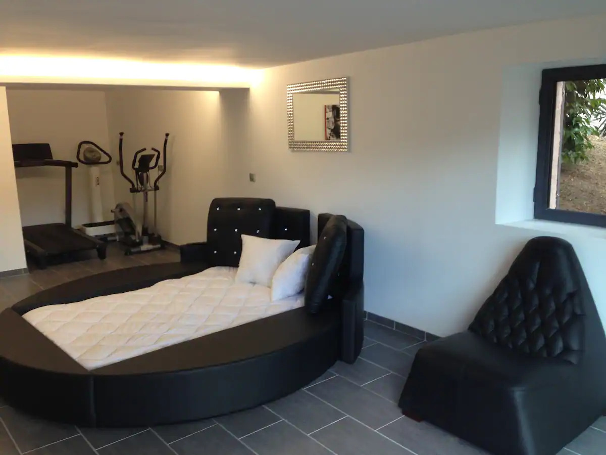 En rez de jardin, une grande suite avec un lit rond dominé d’une baie vitrée inondée par le soleil du matin pour des réveils radieux, suivie d’une chambre avec deux lits jumeaux, créant ainsi un espace familial particulier complété par une salle de douche et des toilettes.