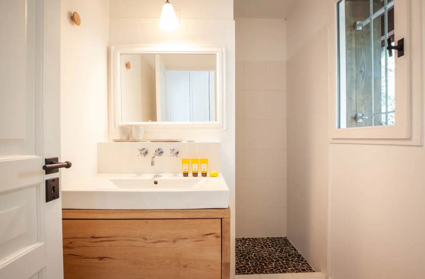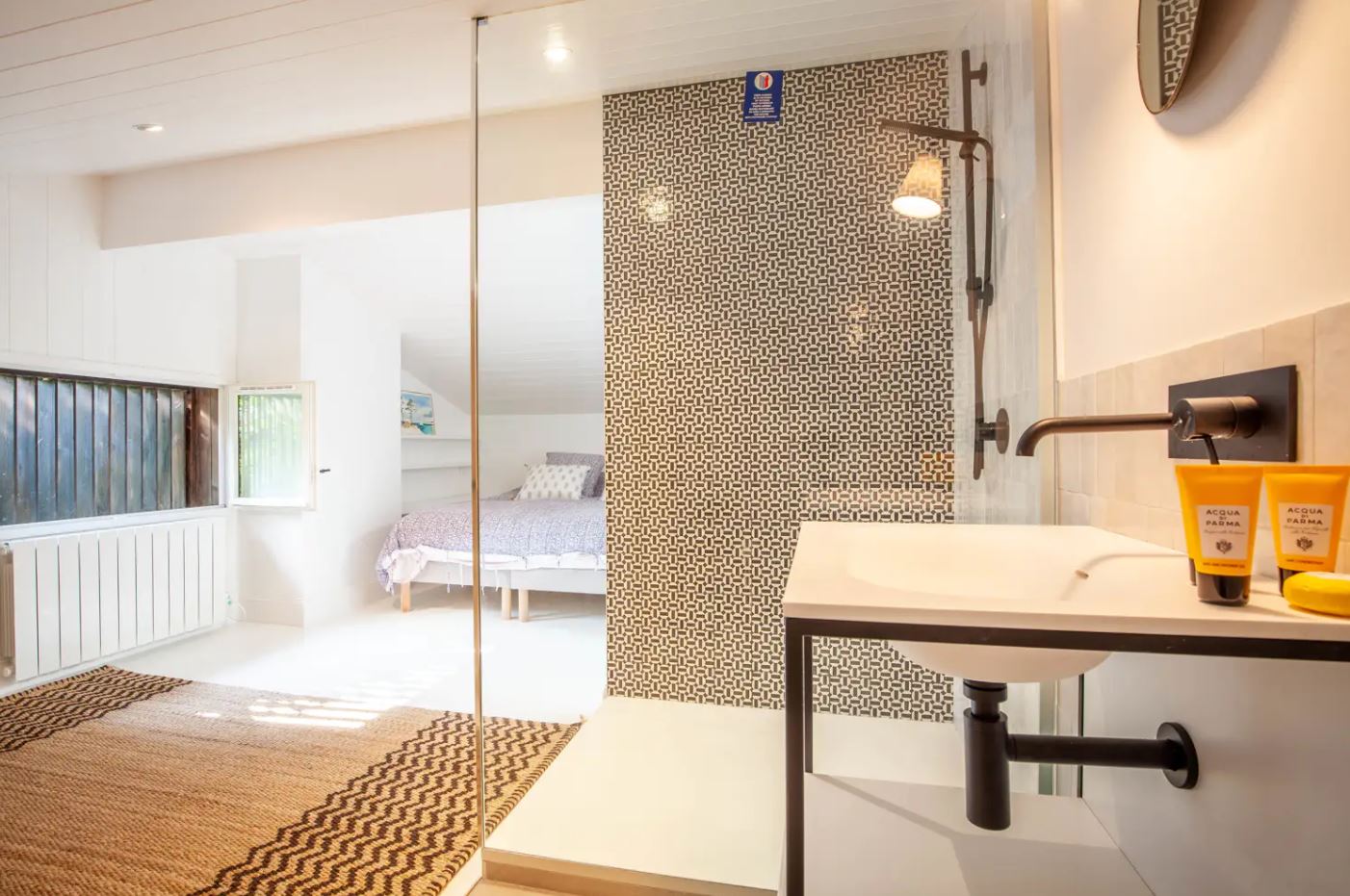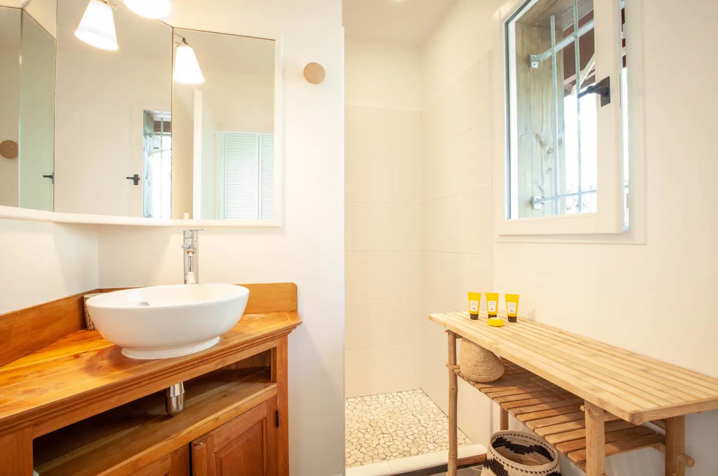 La villa qui sent bon les histoires de famille, comme un retour en enfance, avec des souvenirs des vacances insouciantes. En fait, en pleine nature comme dans un cocon avec des matériaux nobles et des couleurs douces. De plus, au calme devant la piscine pour lire un bon roman, puis se préparer pour le dîner, en ville. En effet, cette villa est divisée en 2 villas attenantes pour l’intimité de chacun.