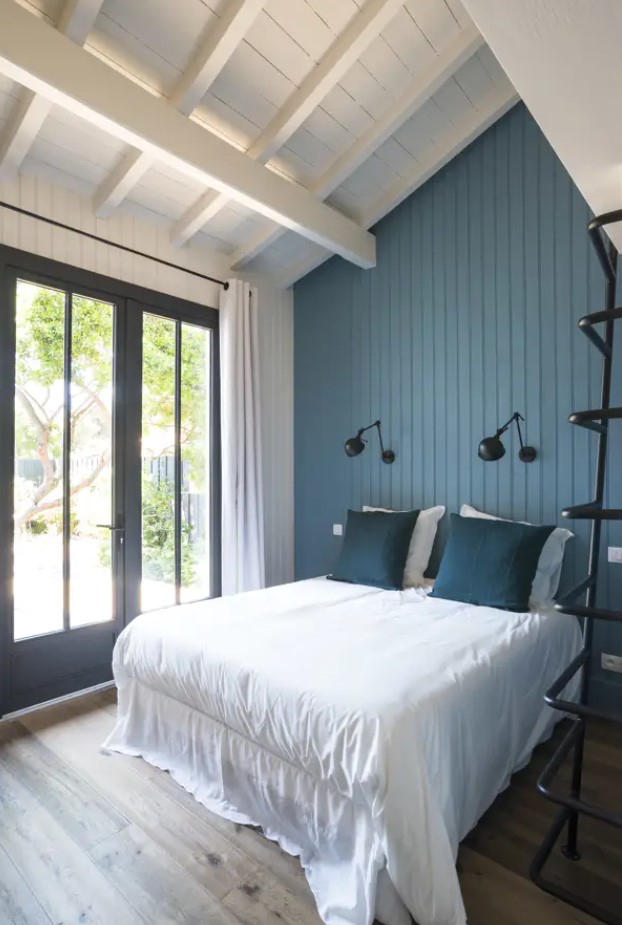La location villa Palomba, une villa de luxe de plain-pied avec un beau jardin. Un espace de vie et des couleurs claires avec des murs en bois peints. C’est les vacances, avec les canapés bleus ciel comme la mer et le ciel.