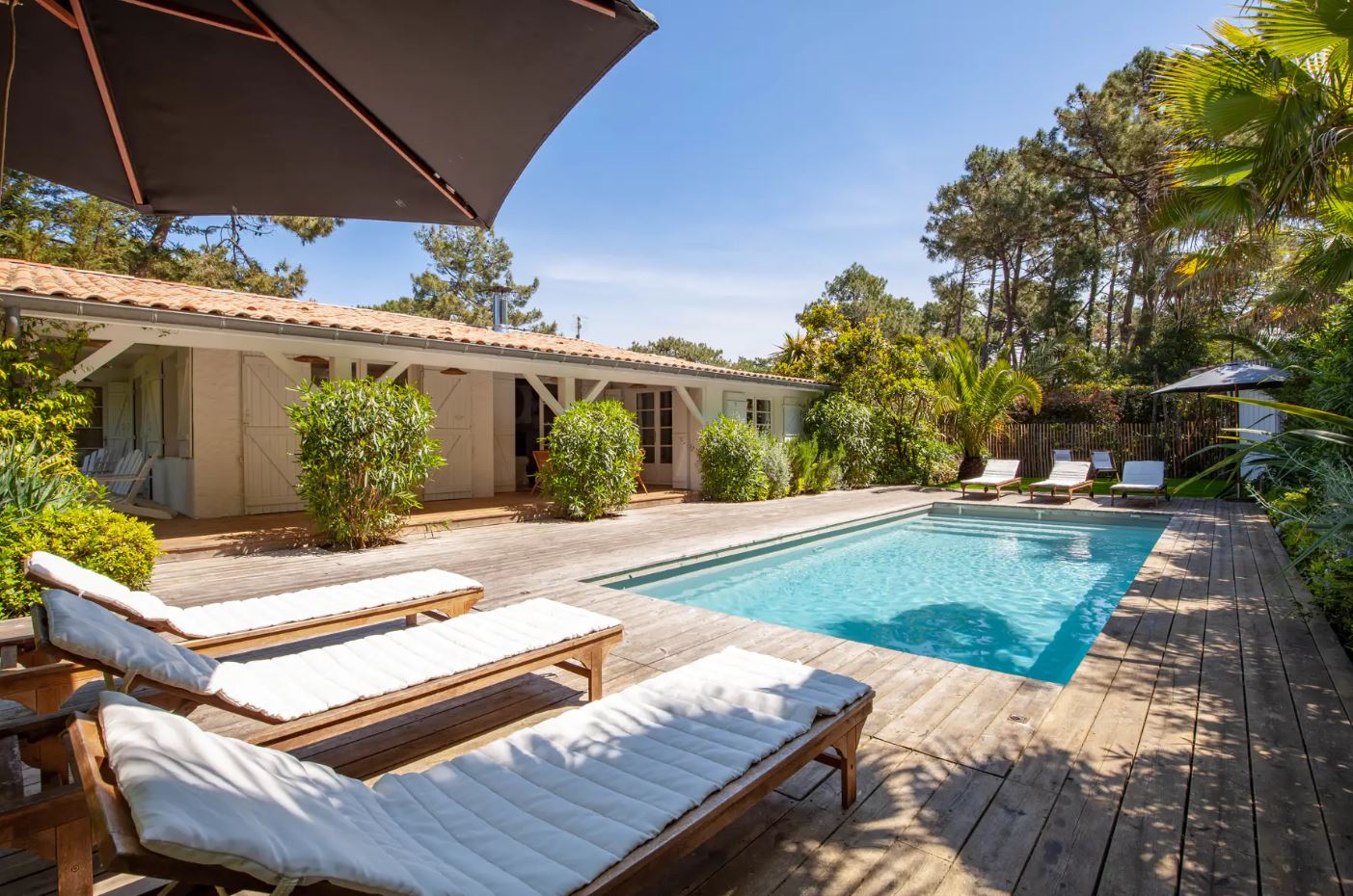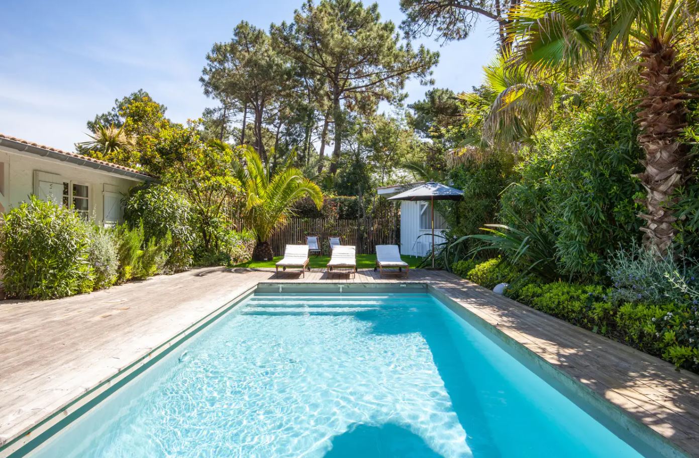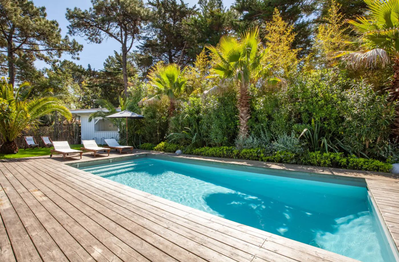 En fait, le jardin de 1000 m² est très bien arboré. Et, l’on peux voir un dégradé de couleur entre le vert des végétaux et la clarté de l’eau transparente de la piscine. Puis, transats sont agréables pour se reposer avant de partir surfer sur l’océan.