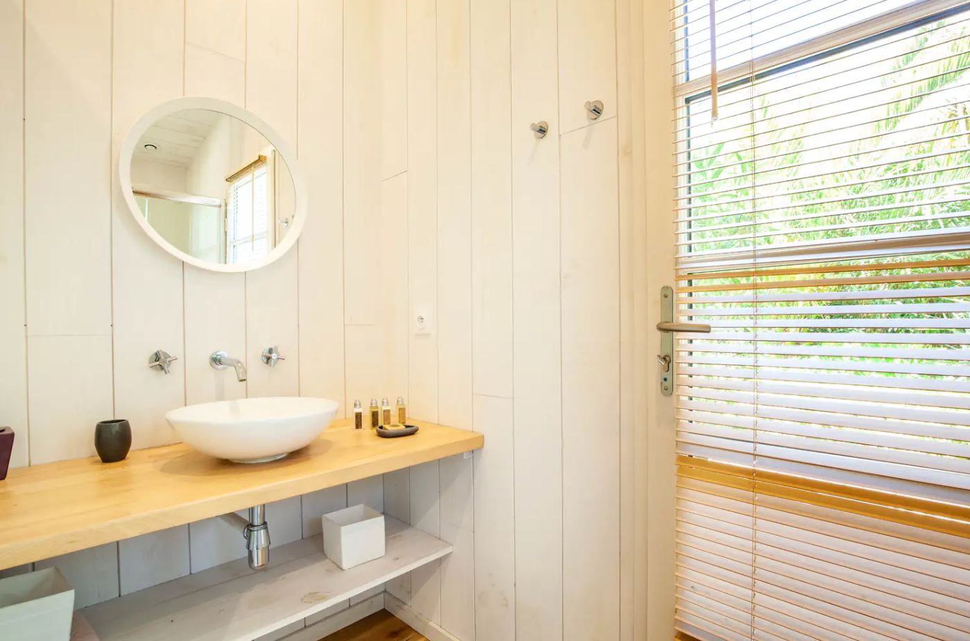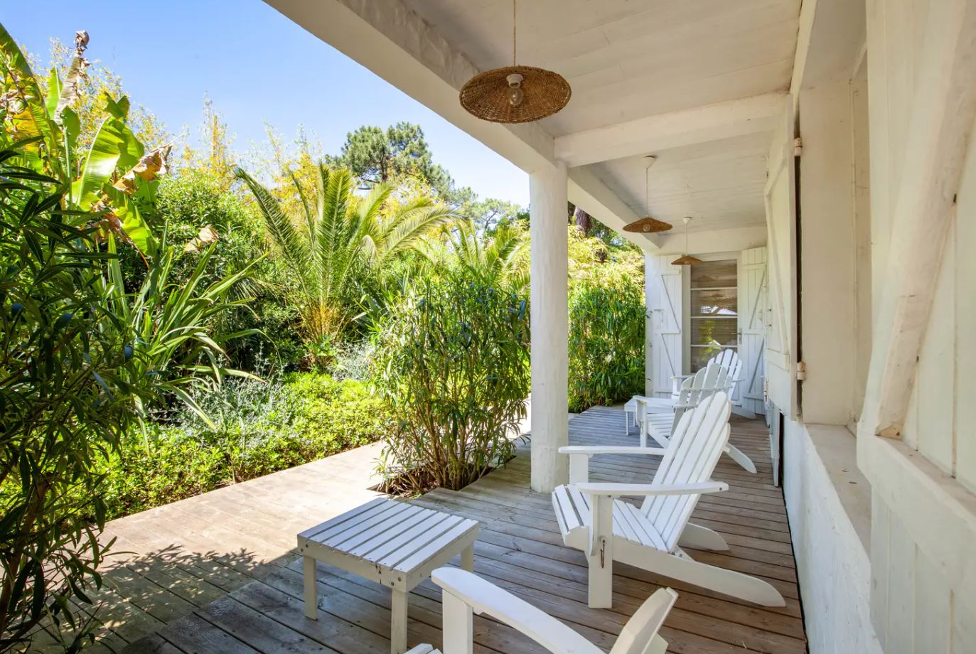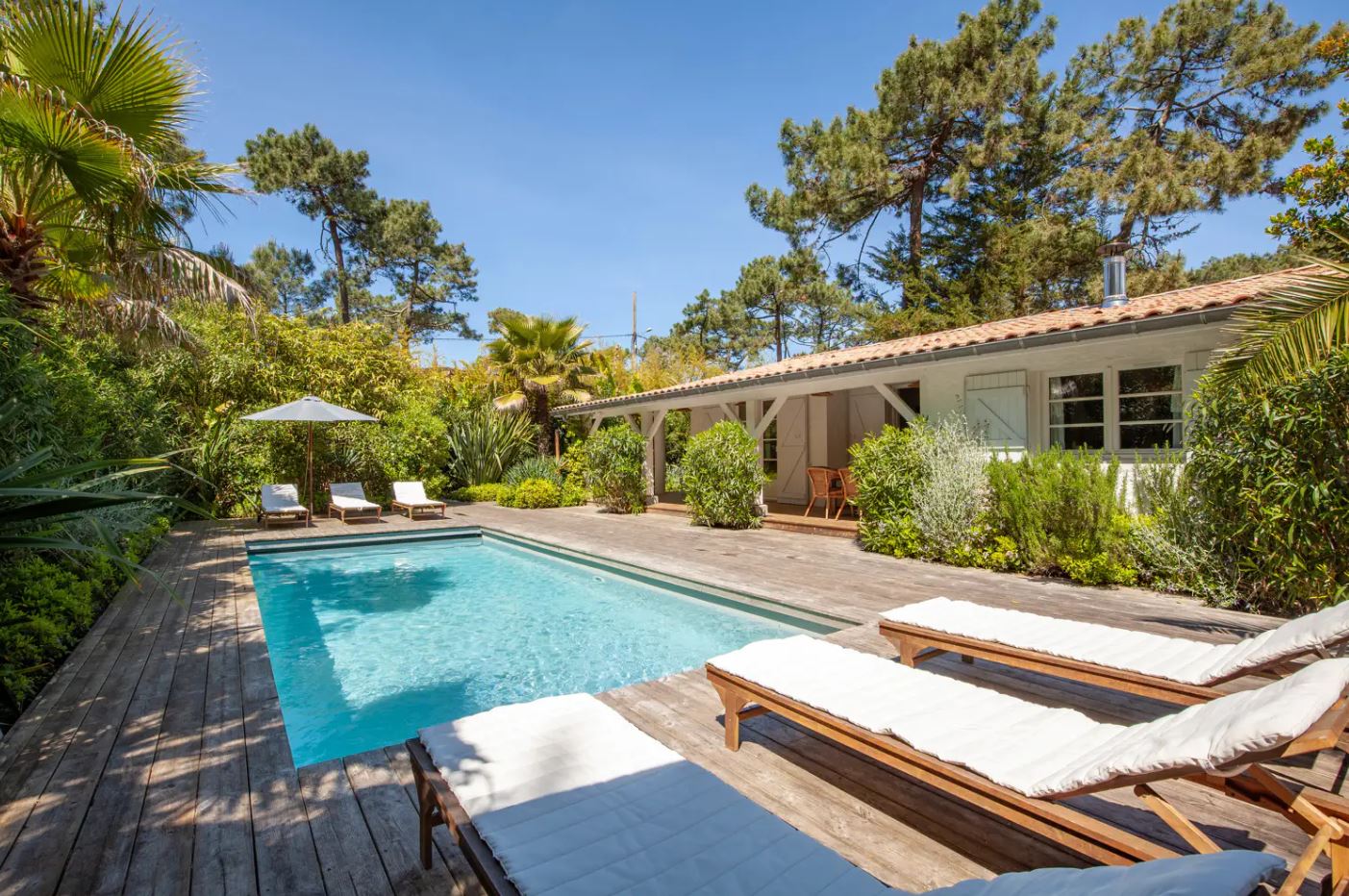 En fait, le jardin de 1000 m² est très bien arboré. Et, l’on peux voir un dégradé de couleur entre le vert des végétaux et la clarté de l’eau transparente de la piscine. Puis, transats sont agréables pour se reposer avant de partir surfer sur l’océan.