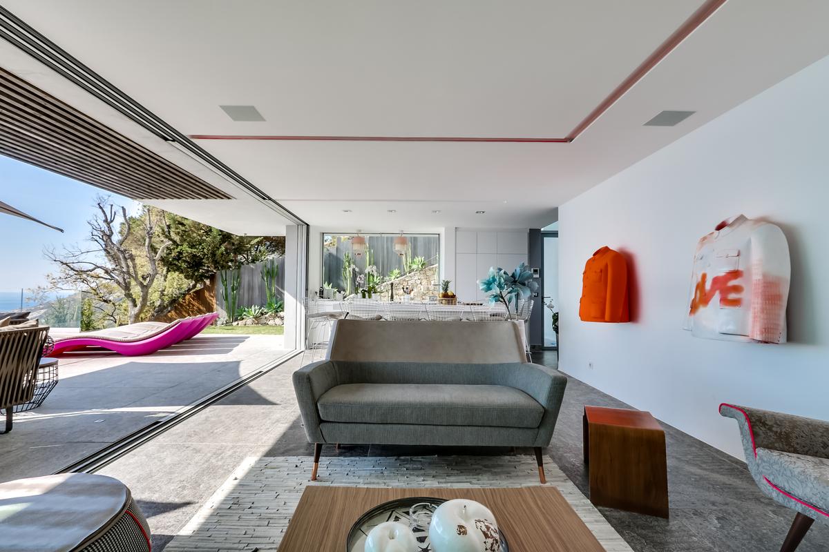 – Séjour avec grandes baies vitrées donnant sur la piscine et la mer, ouvrant sur la cuisine
