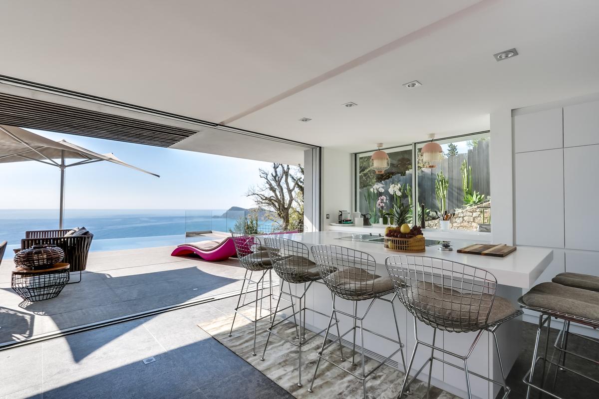 – Cuisine américaine ouvrant sur le séjour et donnant sur la piscine et la mer
