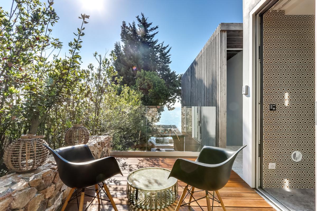 – Terrasse panoramique avec vue sur la mer, avec mobilier de jardin, chaises longues, parasols, table pour 8 personnes