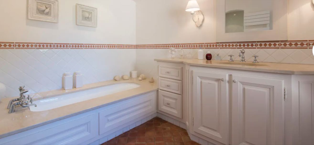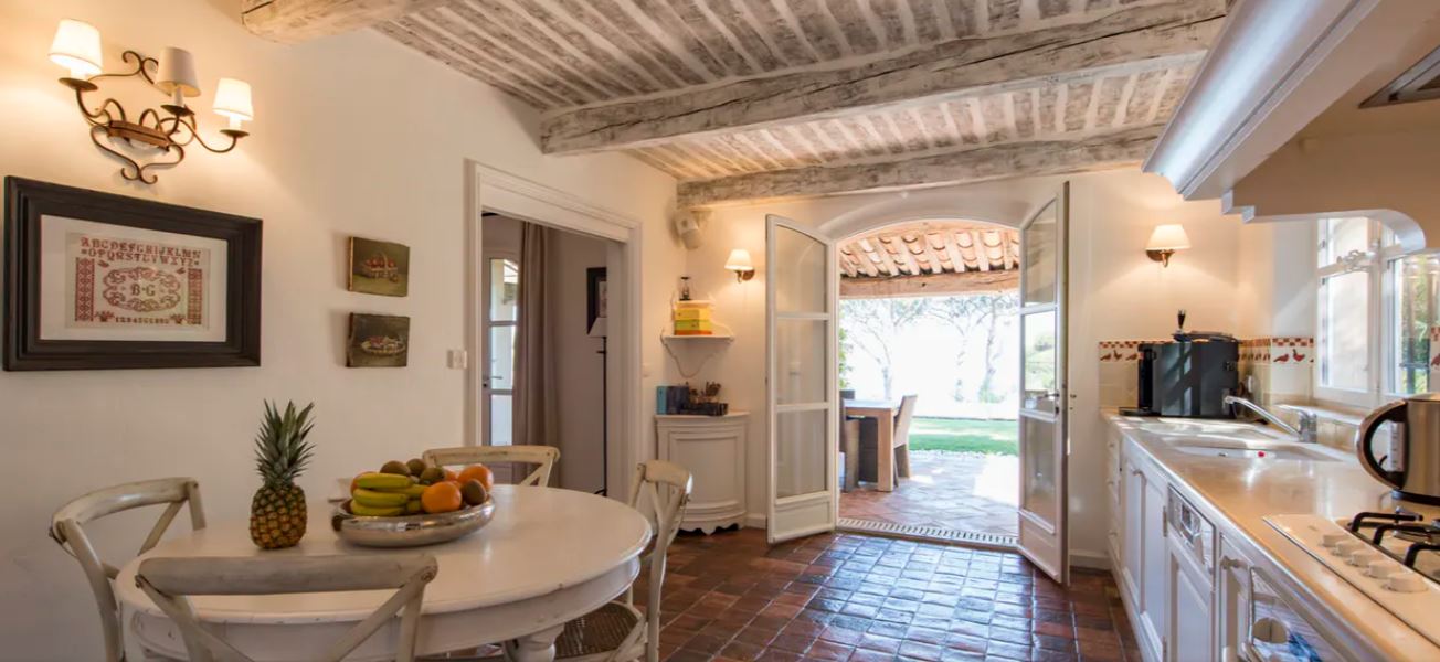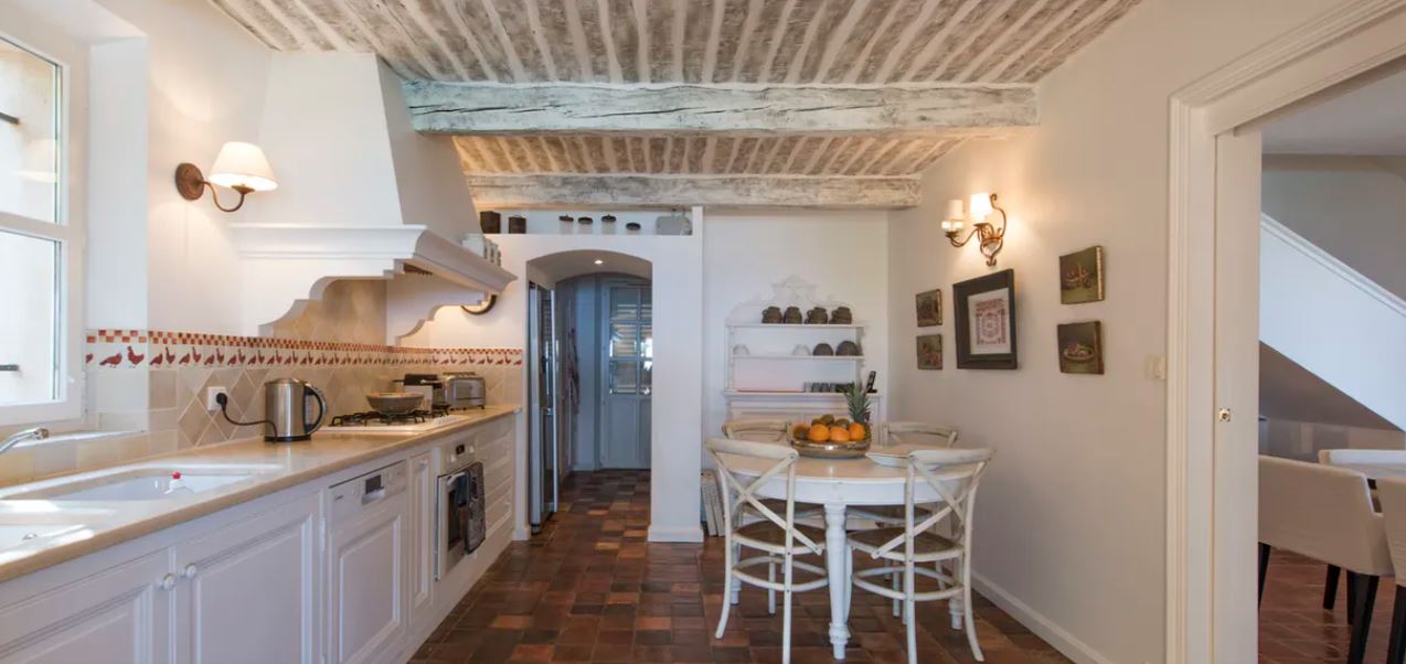 La décoration de style Provençal chic et revisité avec une douceur dans le choix des couleurs et des tissus. Canapé en lin et peinture blanche avec des tableaux pittoresques accrochés au mur. Un grand tapis douillait, des poutres patinées et le carrelage en terre cuite rougeoyant confère un atmosphère très apaisant et convivial à l’espace de vie. La cuisine très fonctionnelle, avec une décoration ambiance bistrot reste dans l’esprit Maison Familiale.