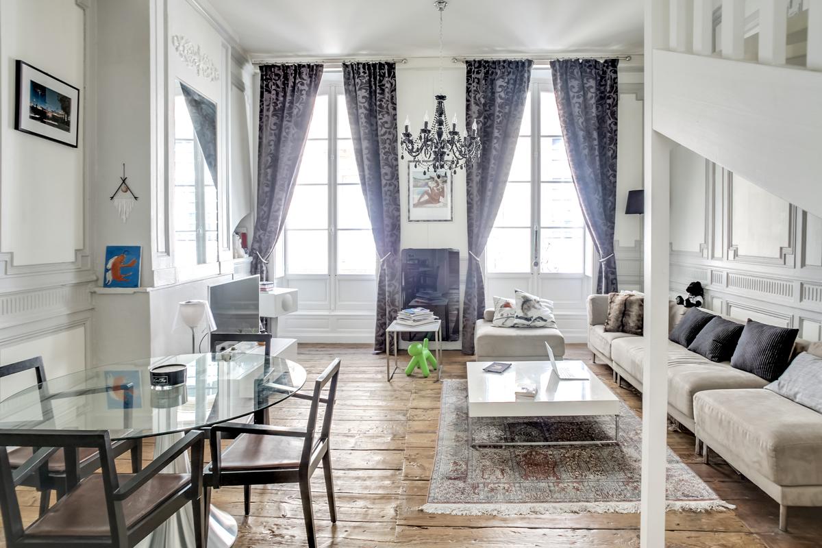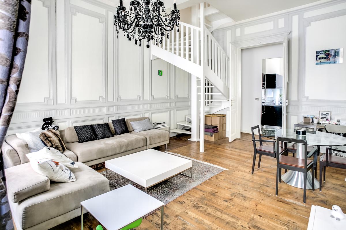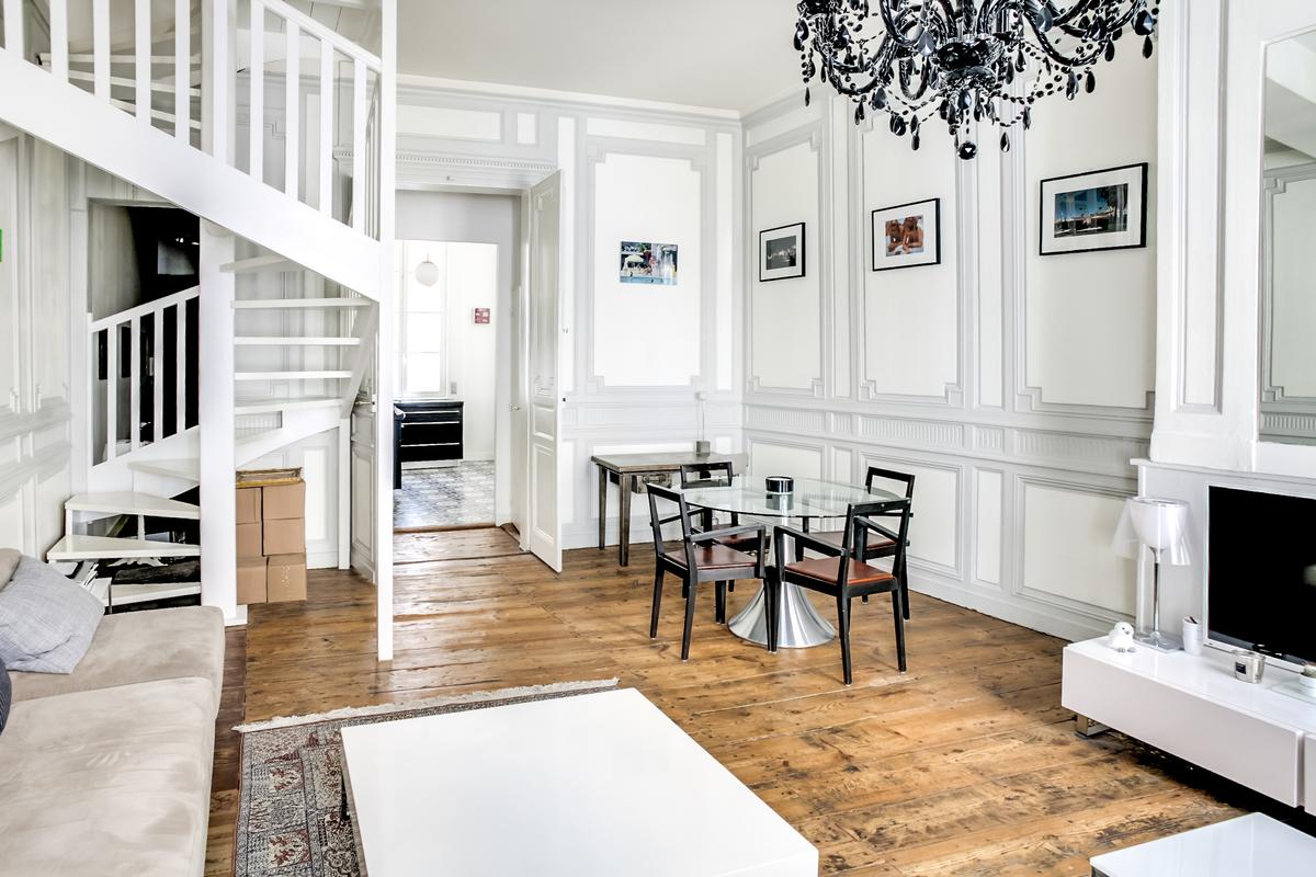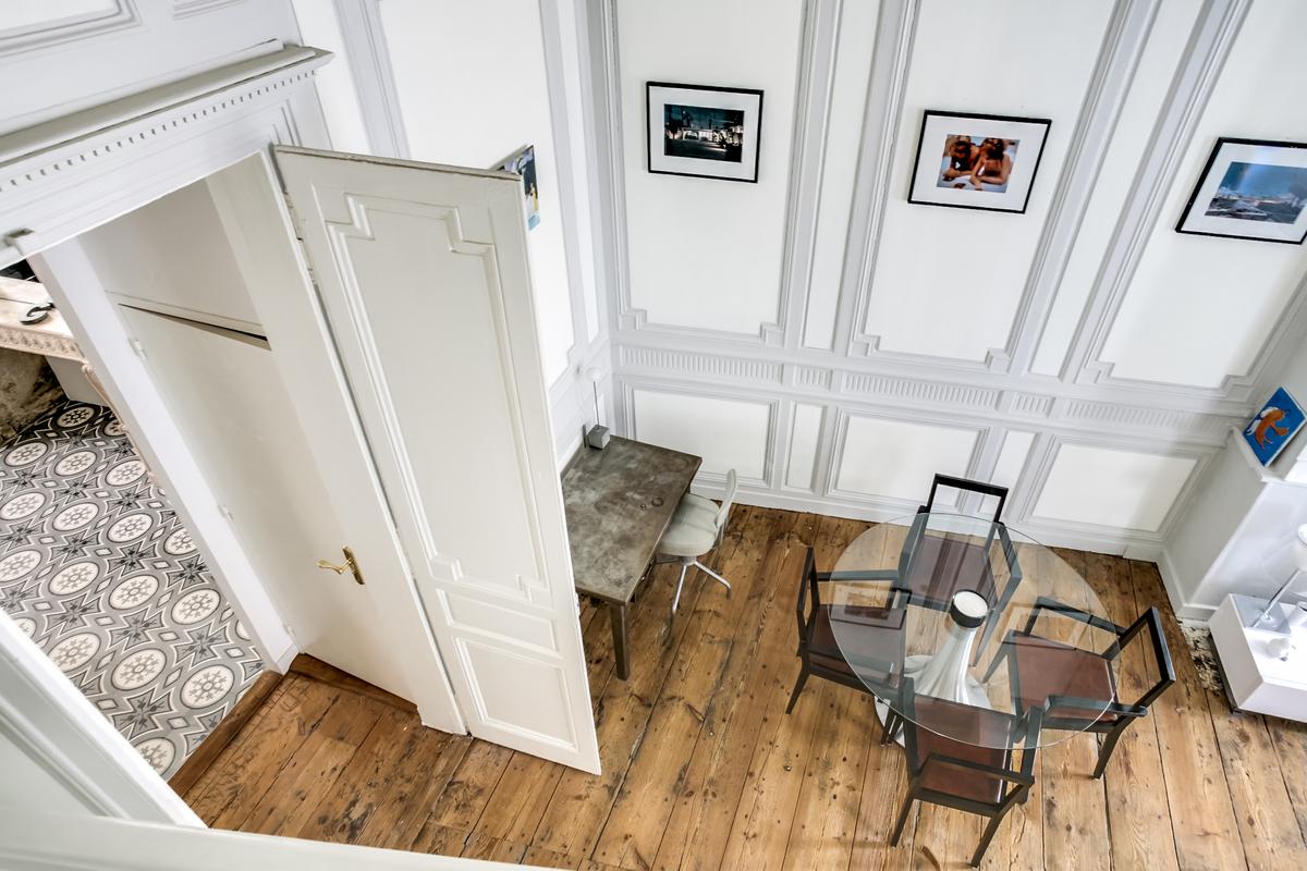 L’appartement se trouve au premier étage d’un bel immeuble ancien rénové, dans une rue calme. Il est directement accessible depuis l’escalier extérieur de la cour. Le décor de l'appartement est fidèle à son sens du lieu, imprégné d'une élégance classique, mais refait dans un style moderne. L’appartement, donnant sur la rue et la cour, a été réaménagé en duplex – l’étage inférieur est un bel espace de vie avec salon et cuisine, tandis que l’étage supérieur est réservé aux chambres à coucher