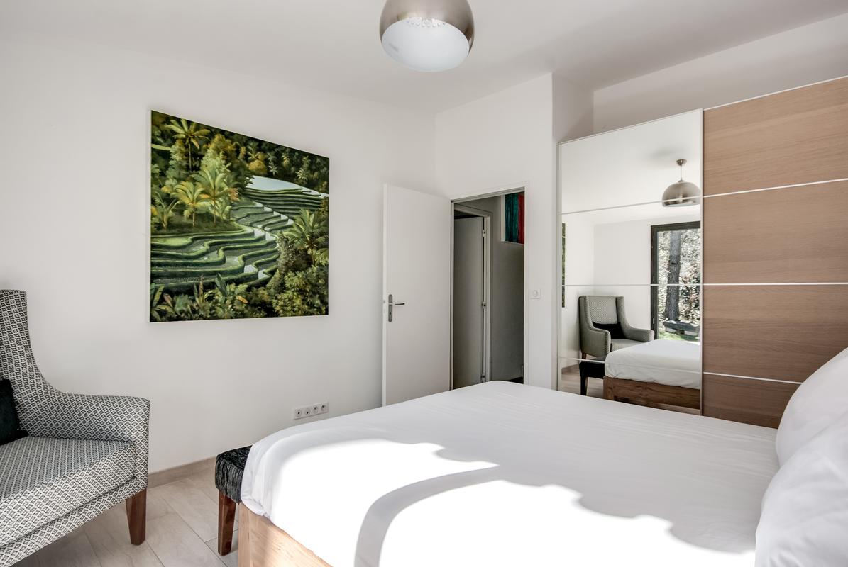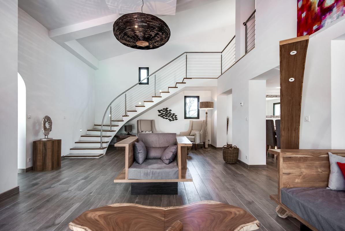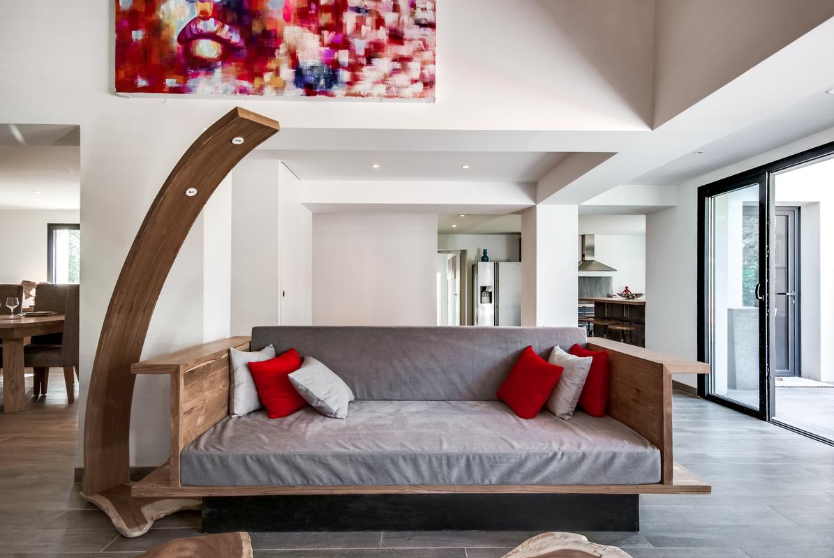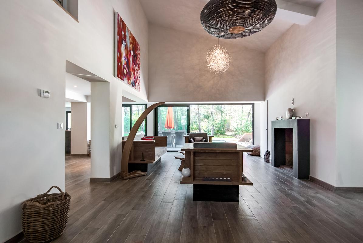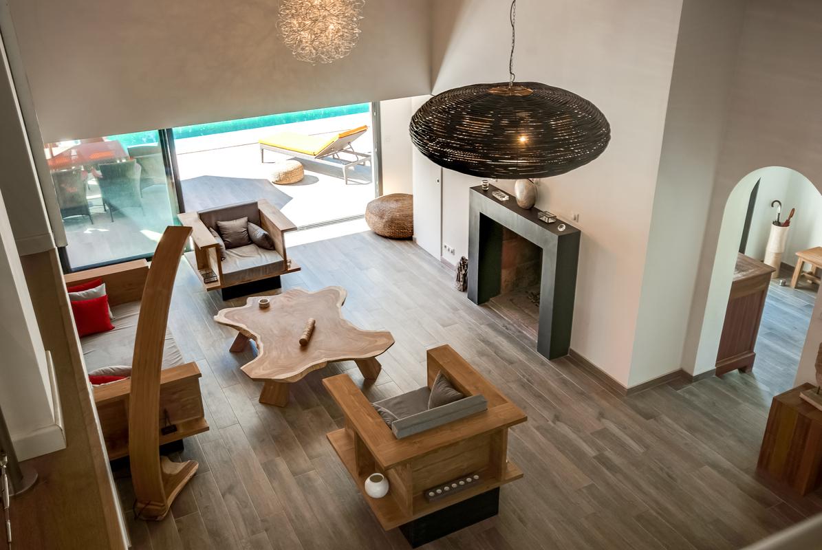 Un intérieur tout aussi harmonieux, où l’esprit moderne vient des meubles exotiques en bois fin, créant une sensation simple, zen et de haute qualité. En ouvrant les grandes baies vitrées du salon et des chambres à coucher, on voit le beau jardin d’herbes aromatiques, la piscine de 10x3m et la terrasse.