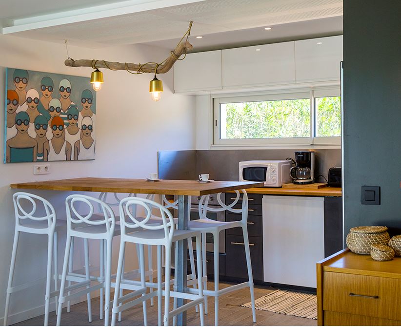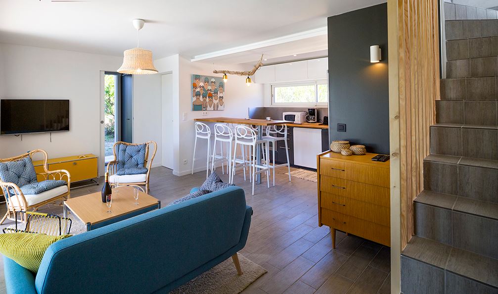 Un espace pièce de vie spacieux avec salon, séjour et cuisine ouverte entièrement équipée. Ensuite, 1 chambre double 160 avec salle de douche et WC de plain pieds. Puis à l’étage, 2 chambres doubles 160 avec salle de douches attenantes et wc indépendant.