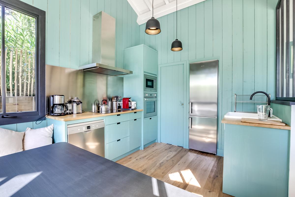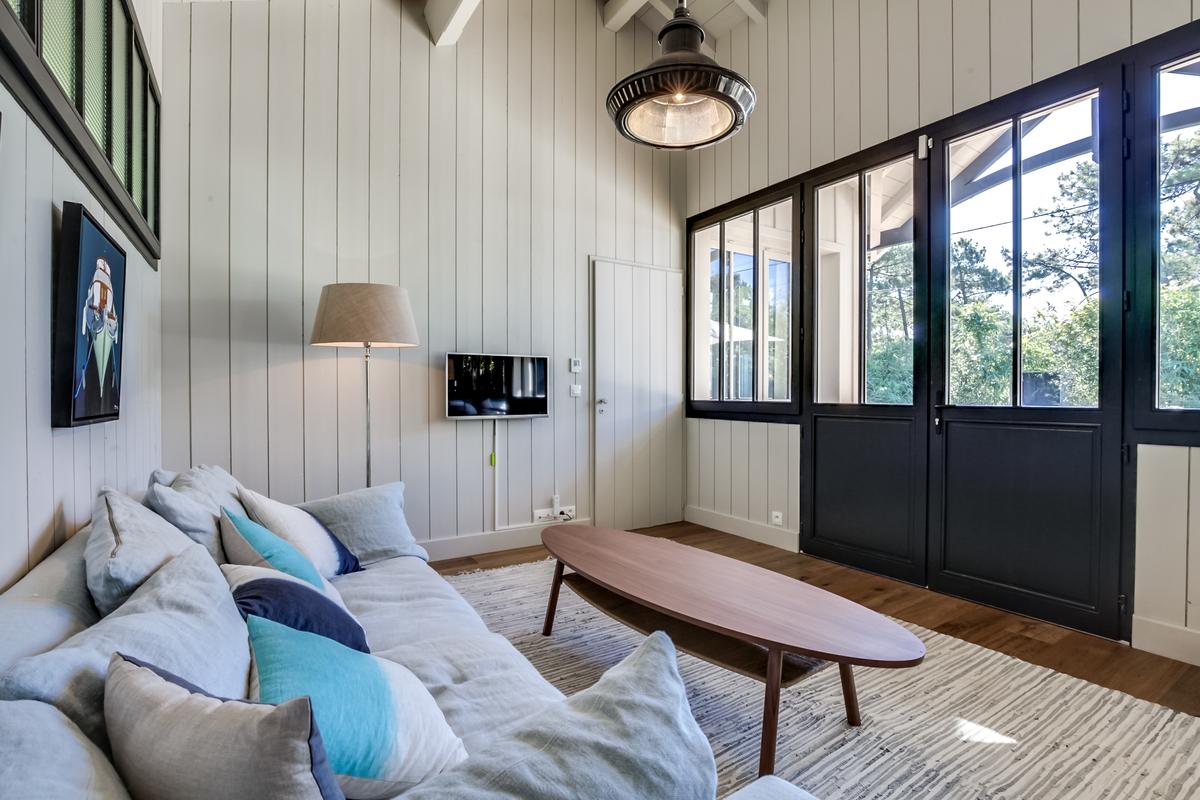 Ce chalet de construction récente est un petit bijou de décoration marine contemporaine, intime et chaleureuse, très bien situé. C’est dans le quartier du phare du Cap Ferret. Ce qui signifie qu’il est facile de tout faire à pied, que ce soit pour aller au marché ou à la plage, que ce soit les plages de l’océan ou celles de la baie.