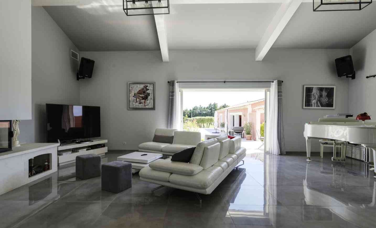 En fait, un vaste salon séjour avec cheminée puis une cuisine ouverte donne le ton du modernisme à cette villa. De plus, les 4 chambres sont spacieuses avec 2 suites avec salle de bain/douche. Et puis, 2 chambres doubles lits séparés et lit 160. Les chambres donnent sur le jardin et les suites ont une petite terrasse personnelle. Puis, la chambre 4 est située dans une partie privée du pool house.