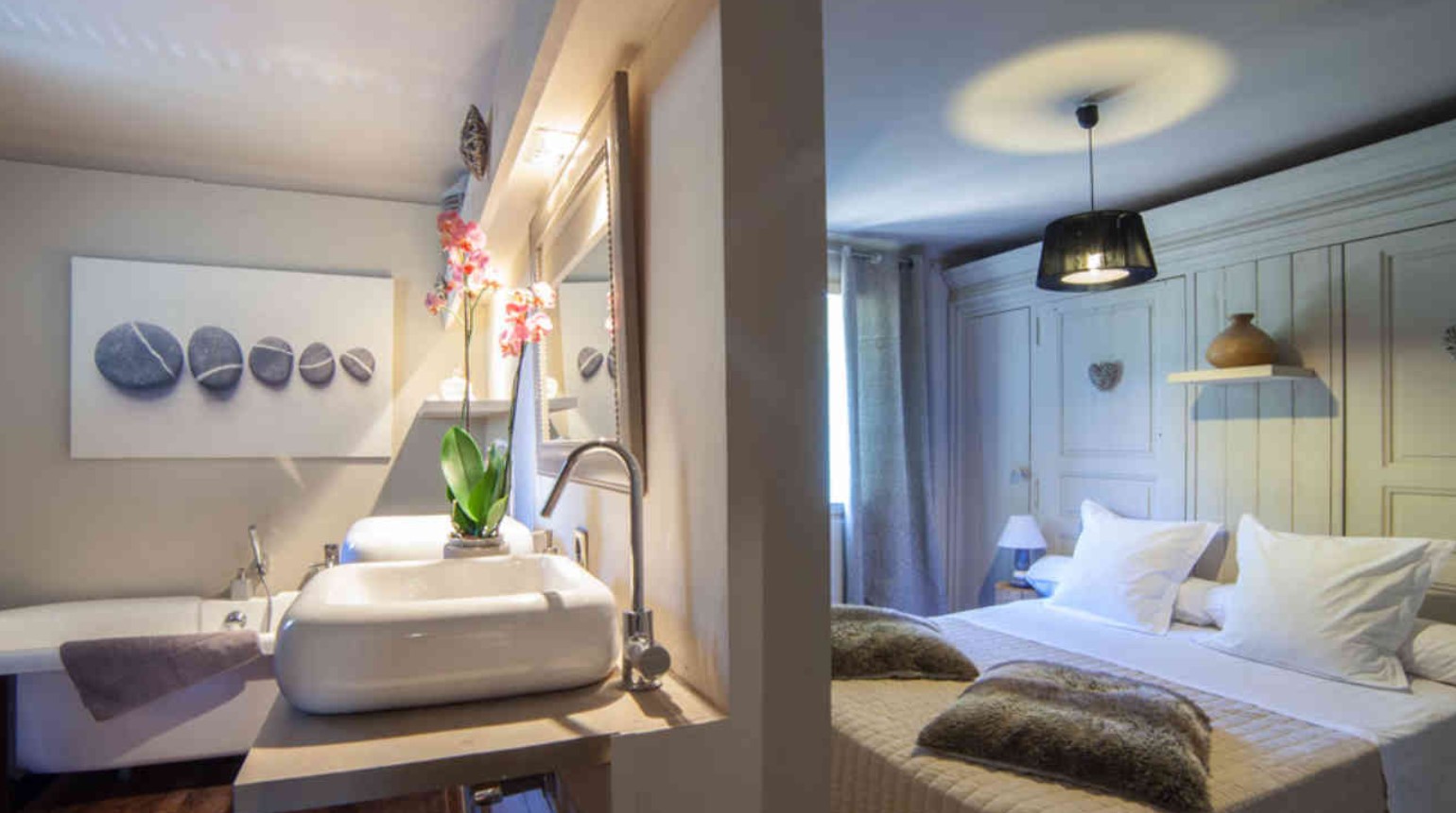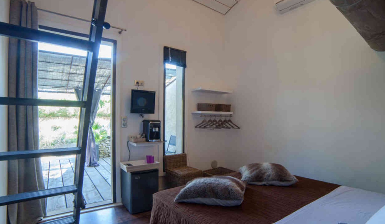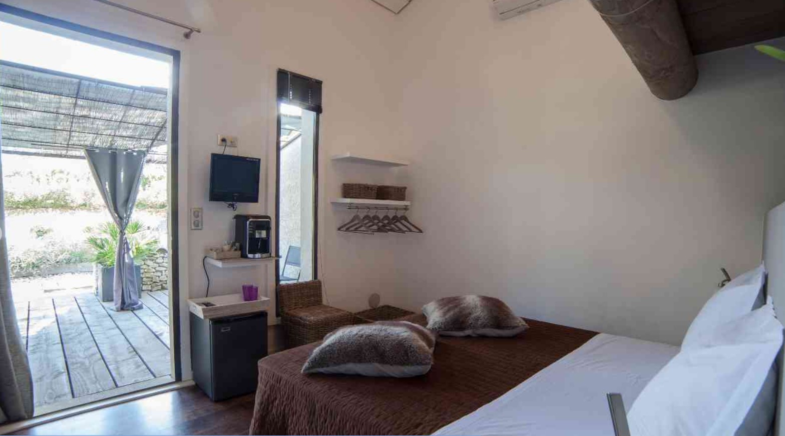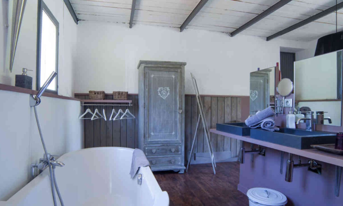En fait, la villa de plain-pied dispose de 5 chambres dont 1 suite parentale avec salle de bain et wc en suite et un équipement coin petit déjeuner avec machine à café et frigo. Puis, les 4 autres chambres avec salle de bain et wc. Quatre chambres ont un jardinet privatif donnant sur la piscine. Donc, nous avons 5 chambres et 5 salles de bain.