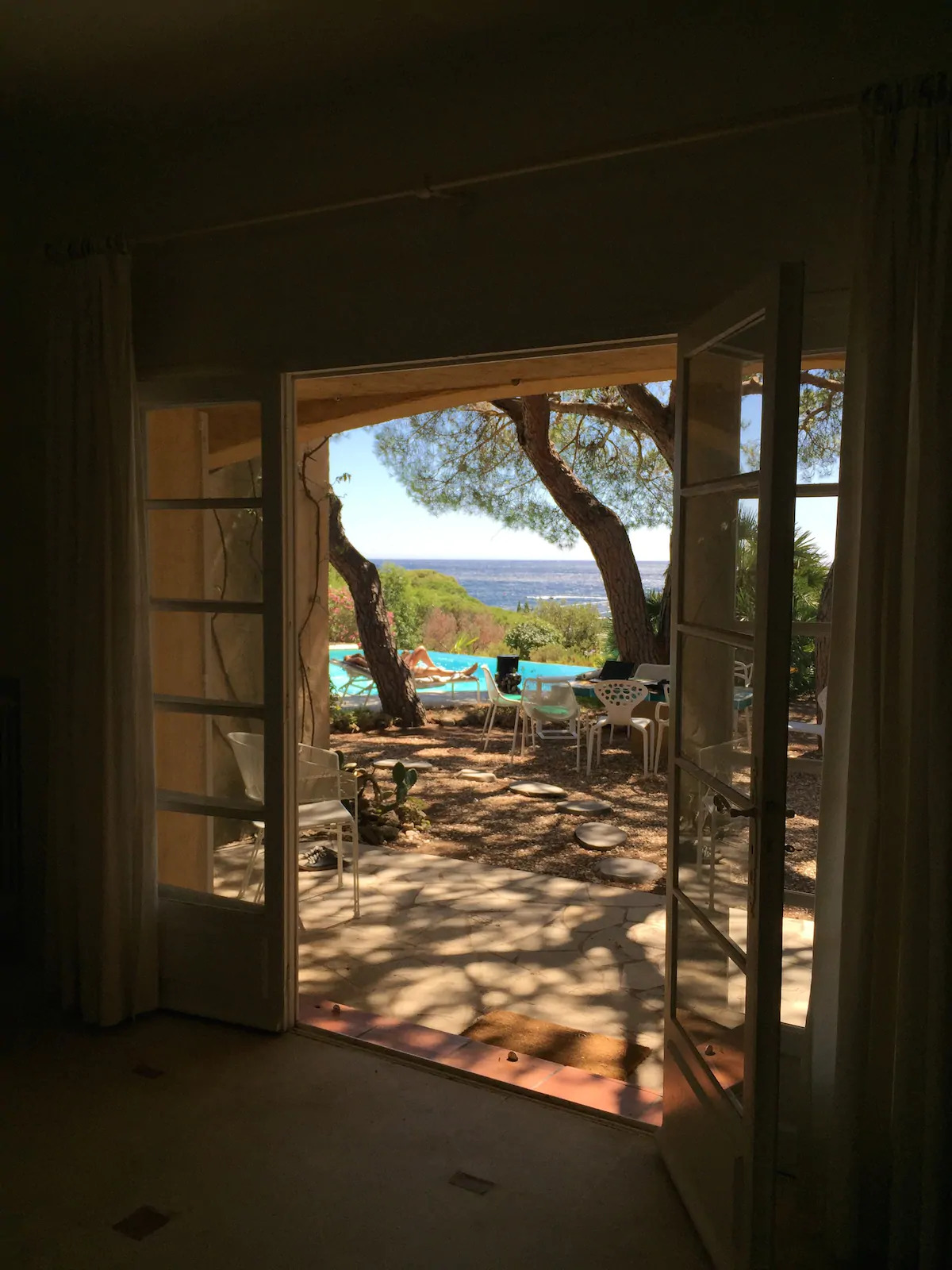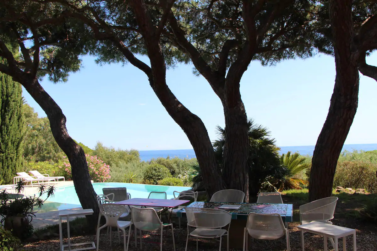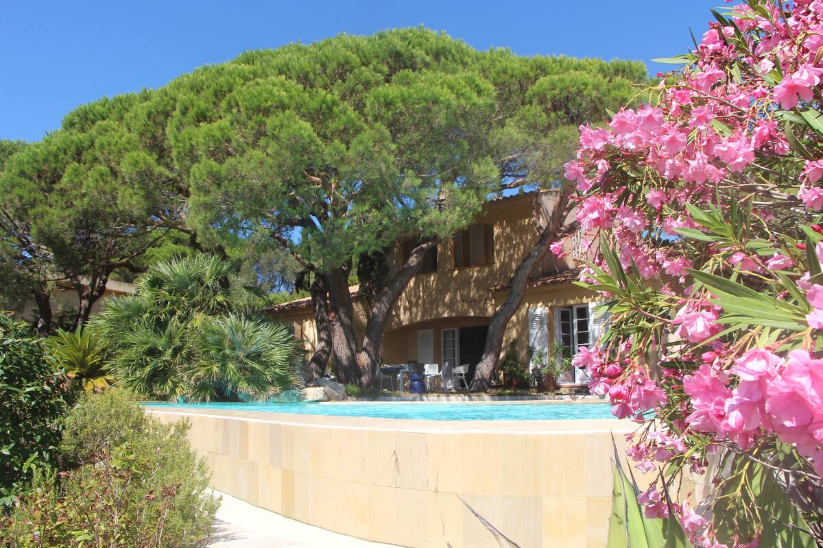 Cette villa est au calme dans une impasse privée, une piscine à débordement et une vue panoramique sur la mer. En fait nous sommes à l’ombre des pins parasols , à 5 mn à pieds de la plage de sable avec restaurants ,activités nautiques, supermarché, port avec locations de bateaux et navettes pour Saint-Tropez.