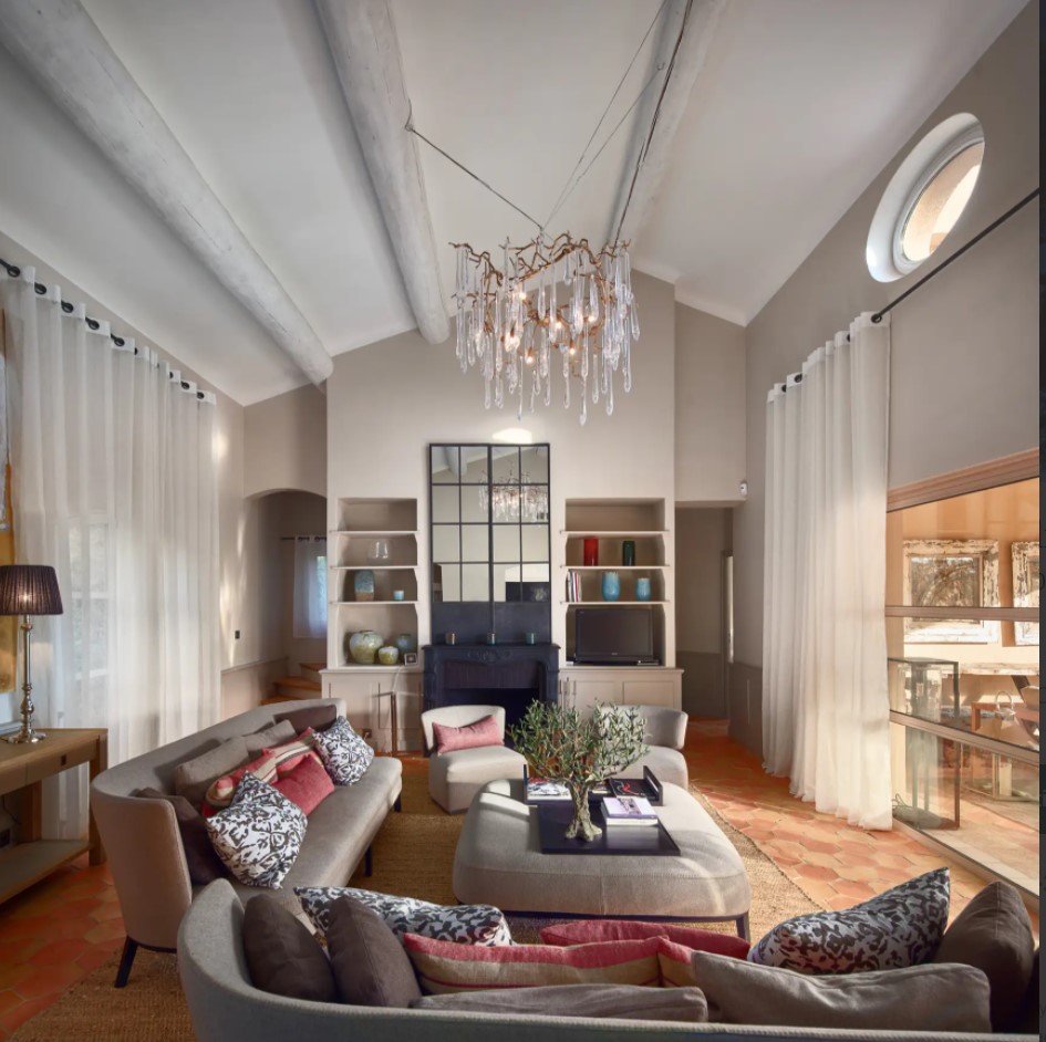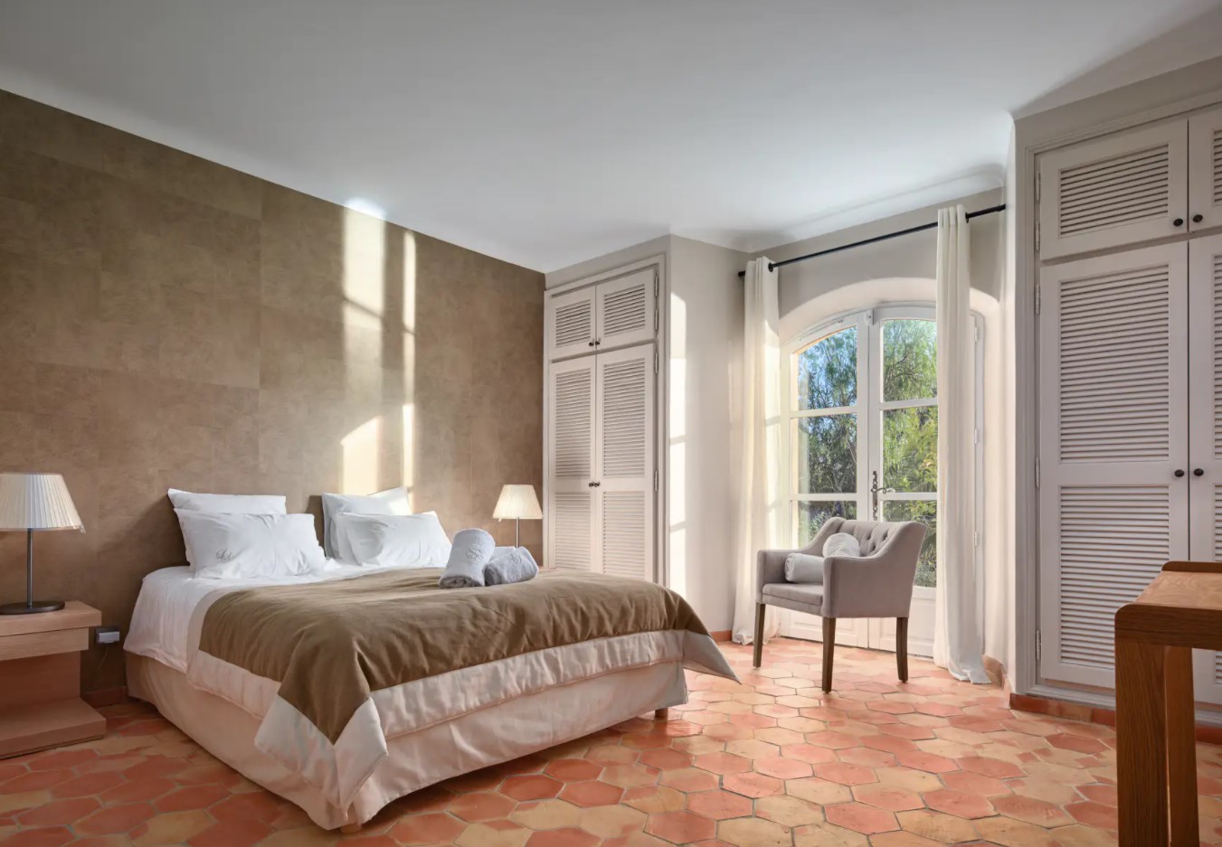 Une grande villa de prestige de 240 m² pour 10 personnes. En effet, de grandes fenêtres blanches et une façade couleur sable, un air de Provence pour cette belle villa de luxe. La décoration en carrelage et poutres de bois remis au gout du jour donnant un style chic contemporain.