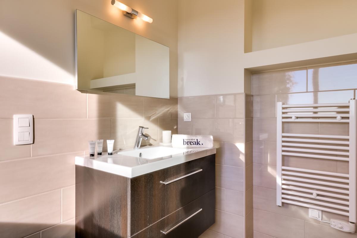 – La Chambre 1, vue mer, terrasse, grand lit, salle de bains attenante (baignoire, douche et toilettes)