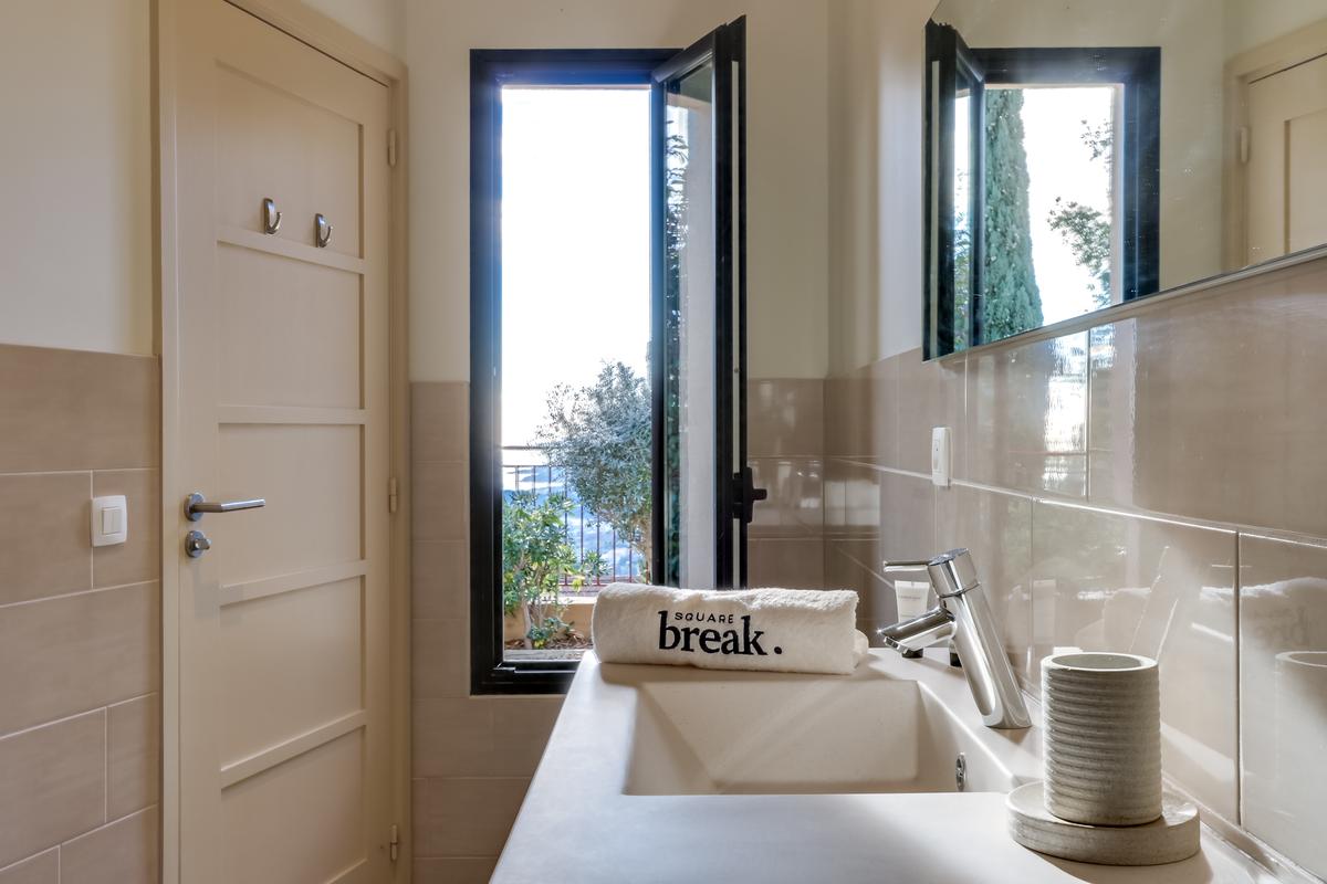 La grande terrasse couverte où l’on peut dîner tout en donnant sur la mer. Puis, la piscine est aussi un endroit idéal pour se détendre. En fait, les quatre des chambres ont une vue sur la mer.