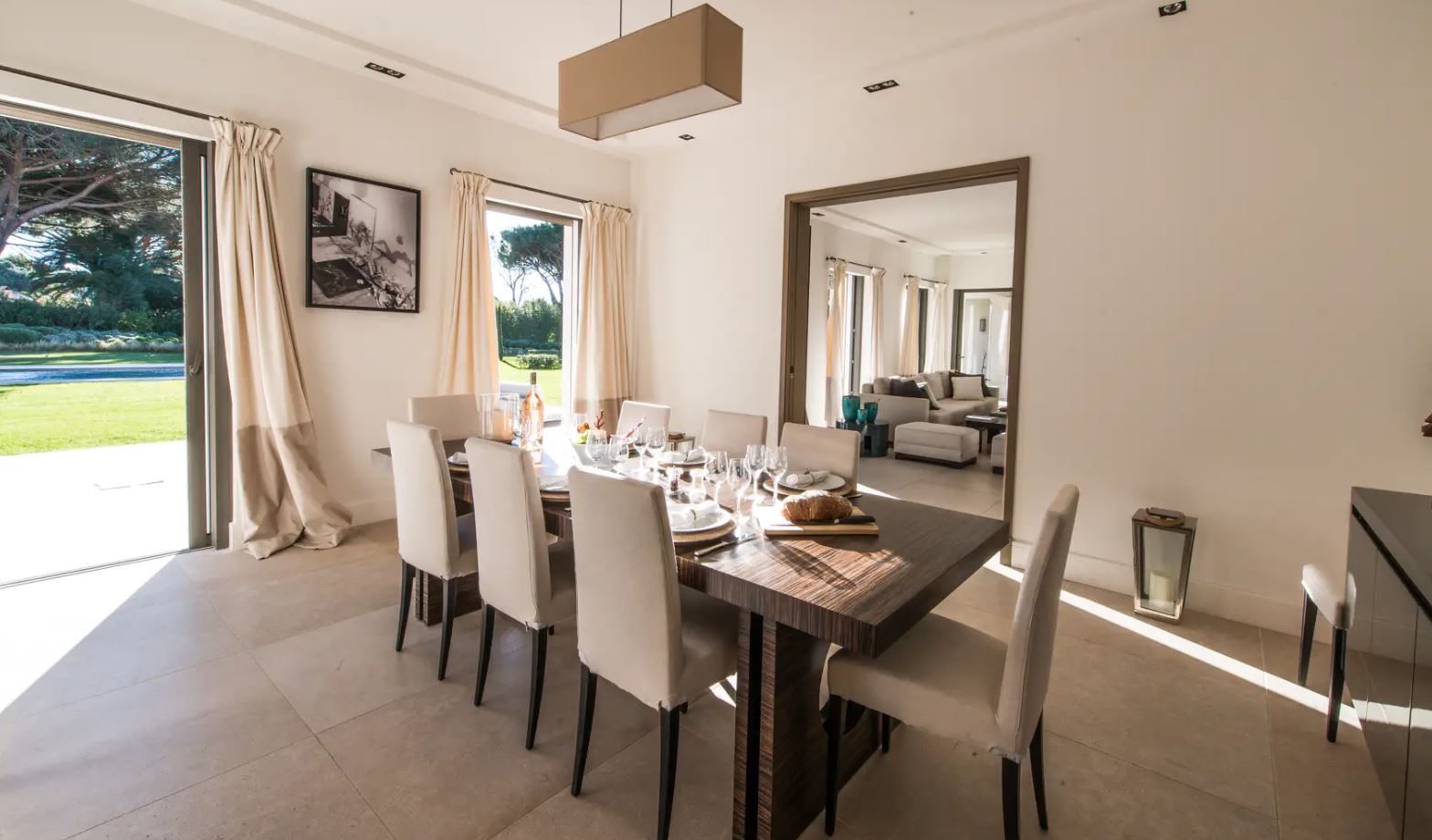 – d’un salon avec cheminée qui s’ouvre sur la piscine, et d’une salle à manger. Ces deux pièces donnent sur le jardin et la terrasse.