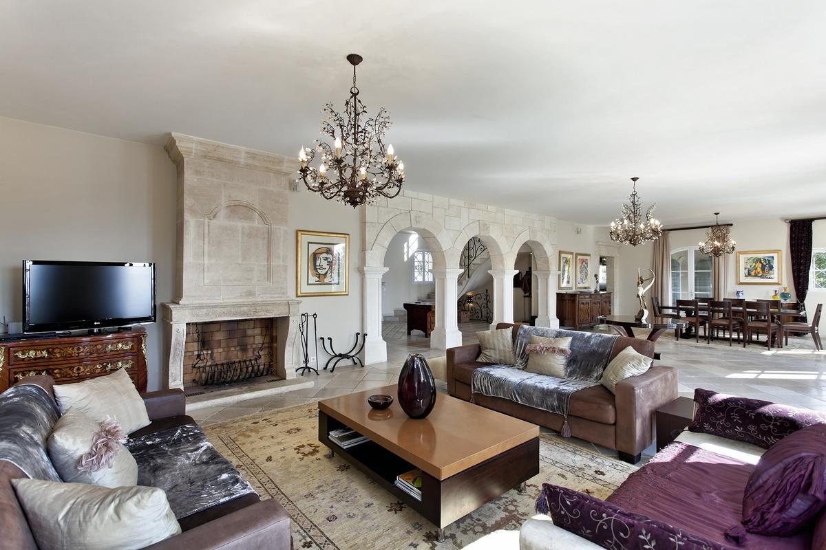 En fait, cette villa de luxe possède de grandes pièces de vie, un salon séjour de 80 m² et équipé en mobilier confortable. Puis, un espace télévision avec cheminée, écran plat reliés par satellite comme tous les téléviseurs de la villa. Le salon donne directement sur la terrasse de la piscine. Et en plus, de là une belle vue sur le Royal Golf Mougins et l’Esterel. En fait, une autre terrasse couverte avec espace repas équipée avec barbecue et une table pour recevoir 10 convives.