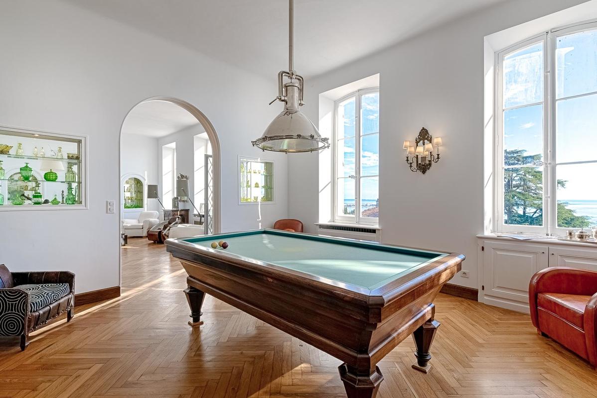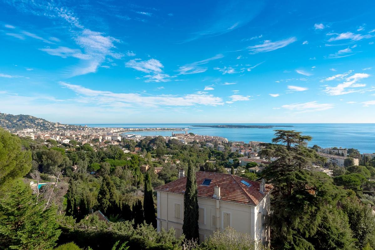 Cette splendide villa des années 1850 règne dans un cadre privilégié sur les hauteurs de Cannes. La propriété, avec son parc bordé d’arbres, est située dans un quartier résidentiel calme, à seulement 10 minutes du centre-ville. La villa est à la fois classique et moderne, et associe à merveille différents styles: architecture authentique, design intérieur sophistiqué, mobilier contemporain et décoration soignée dans chaque chambre. Les installations haut de gamme de la villa sont rehaussées par son élégance raffinée. Le rez-de-chaussée comprend un grand salon avec cheminée qui s’ouvre sur une salle de billard et une magnifique cuisine entièrement équipée. Au deuxième étage, vous trouverez un deuxième salon, ainsi que deux chambres avec salles de douche privatives, toutes dotées de balcons et d’une vue magnifique sur la mer. Vous pourrez profiter de la même vue depuis les trois chambres du deuxième étage. À l’extérieur, une passerelle mène à une belle terrasse en bois offrant une vue panoramique sur Cannes, des transats et une grande piscine de 11 x 4 m et pool house (chambre, kitchenette et salon).