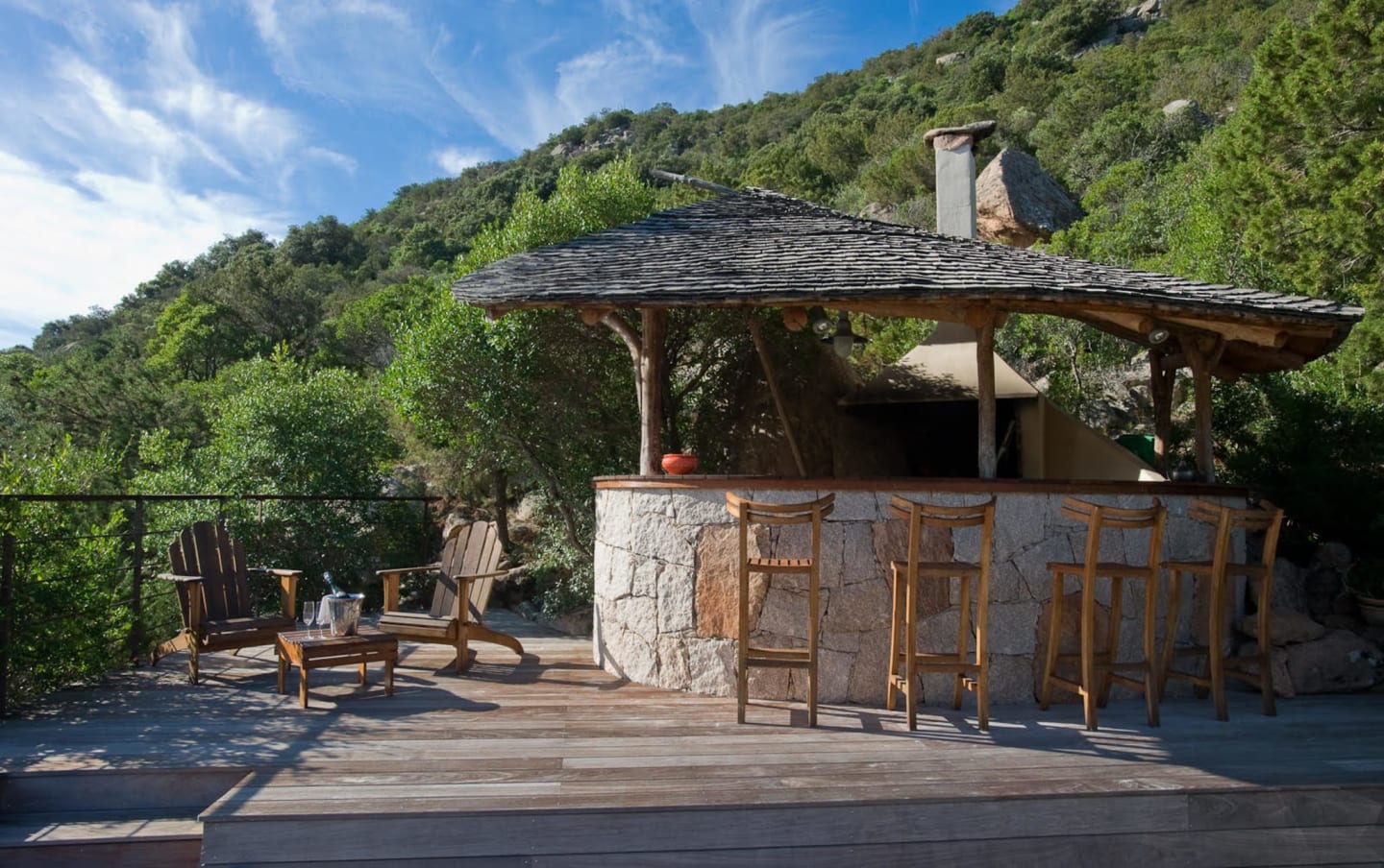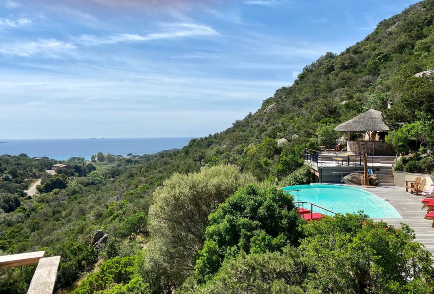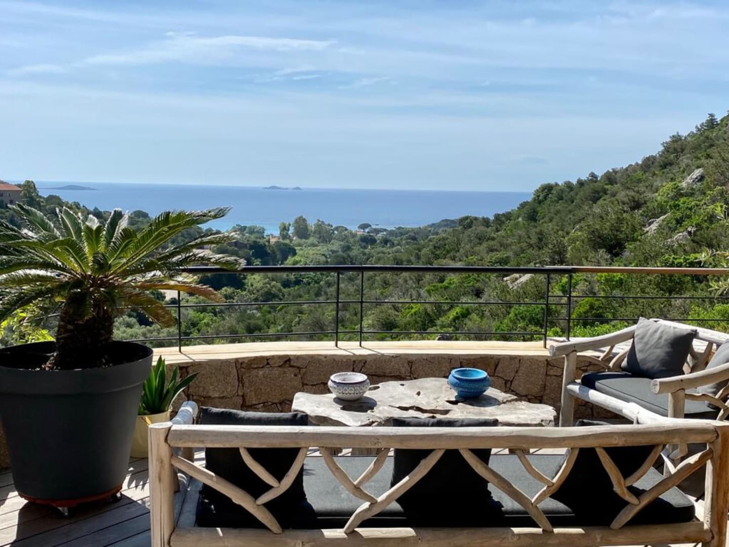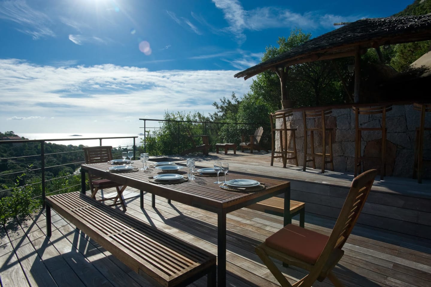 La villa a été construite dans les collines au sud de Porto Vecchio, surplombant la mer dans un cadre de garrigue corse typique.