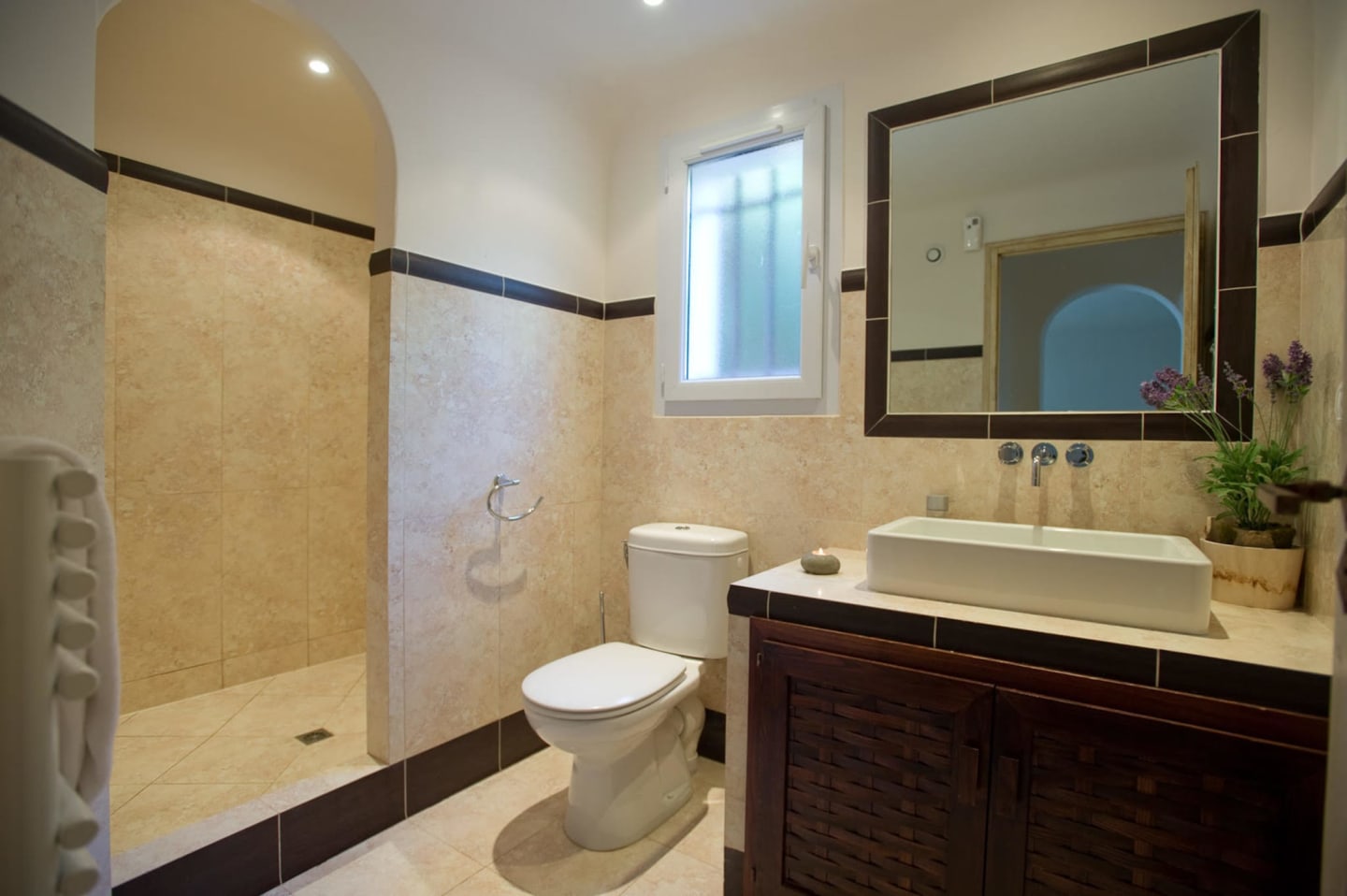 Premier étage: • Chambre 3 – 2 lits jumeaux (90cm), salle d’eau attenante avec WC • Chambre 4 – lit queen size (160cm), salle d’eau attenante avec WC • Chambre 5 – lit king size (180 cm), salle de bain avec baignoire, douche et WC.